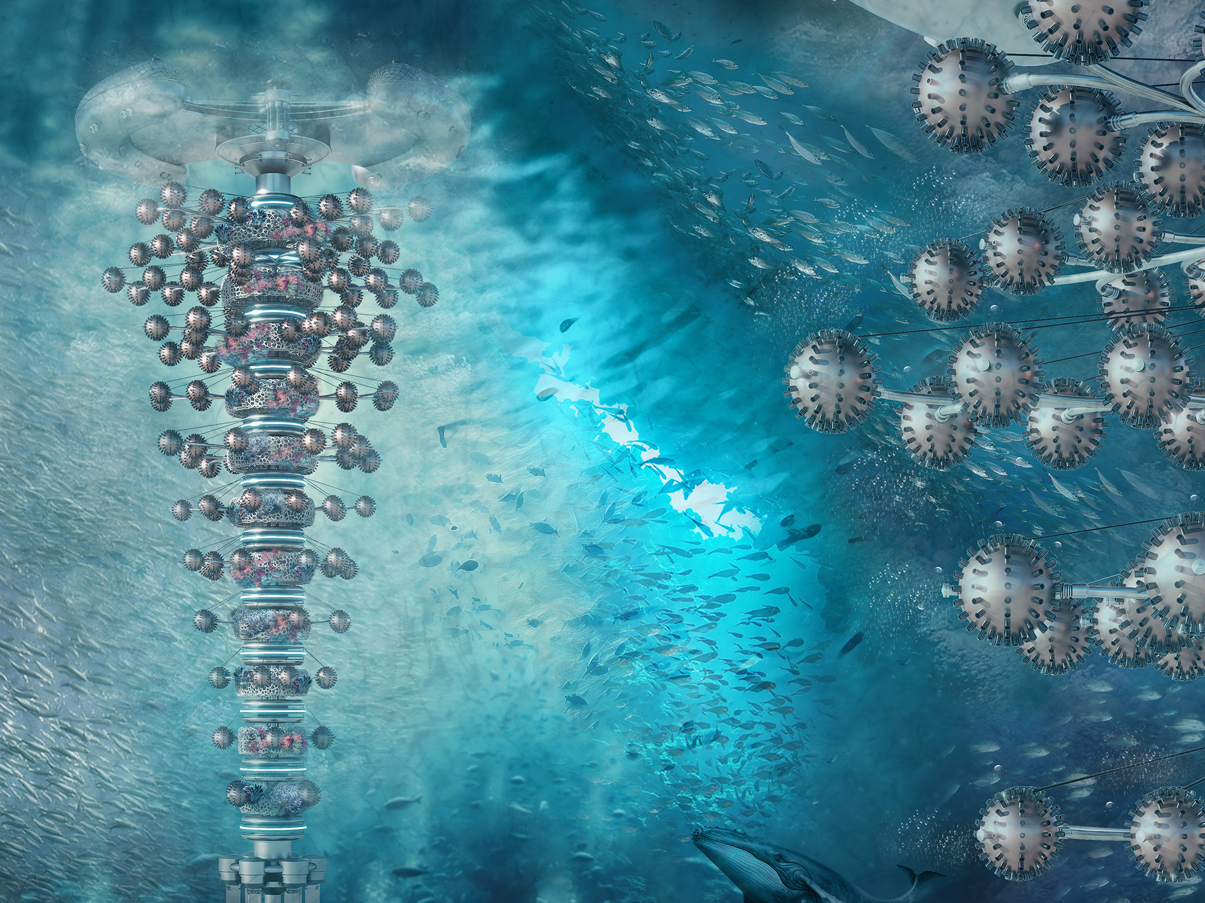OCEAN LUNGS designed by Mohammed Noeman Coutry, AbdelRahman Mahmoud Badawy, Toka Hassan Taman, Amr Khaled Mahmoud AbdElsstar, Hend Mahmoud Hassan Rashad, Menna Tallah Mahmoud Fouad, Mohamed Mahfouz Abdelaziz Abdelwadoud, Nagwa Khaled Mohamed Mohamed, Norhan Mohammed Abdel-Hamid Abdel-monem, and Omar Ahmed Salah Mohamed from Egypt received the THIRD PLACE in the competition. This project proposes a 1 kilometer deep underwater skyscraper designed to filter the CO2 excess in the oceans by using the latest carbon capture technology.