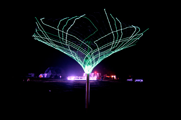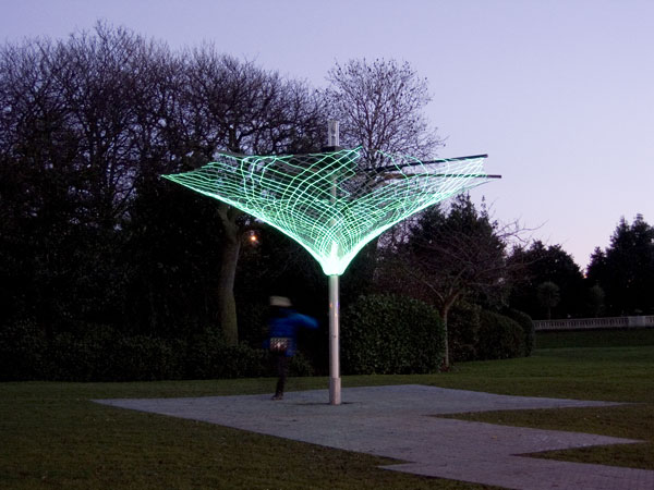 The first version of Sonumbra was realized as a responsive play space in Mowbray Park, Sunderland. It is designed to respond to the interplay and activity of the people orbiting the umbrella by casting a sonic shade of light. The playful atmosphere of rhythms, luminous patters and harmonies is composed by the visitors’ movement – active or passive. the light emitting textile is crafted into a lacework of many electro-luminescent fibers and animated in concert with the generated surround sound and visually illustrates the visitors’ position within the constellation. Visitor’s engagement plays a part and the composition becomes unique assemblage of light, sound and space.