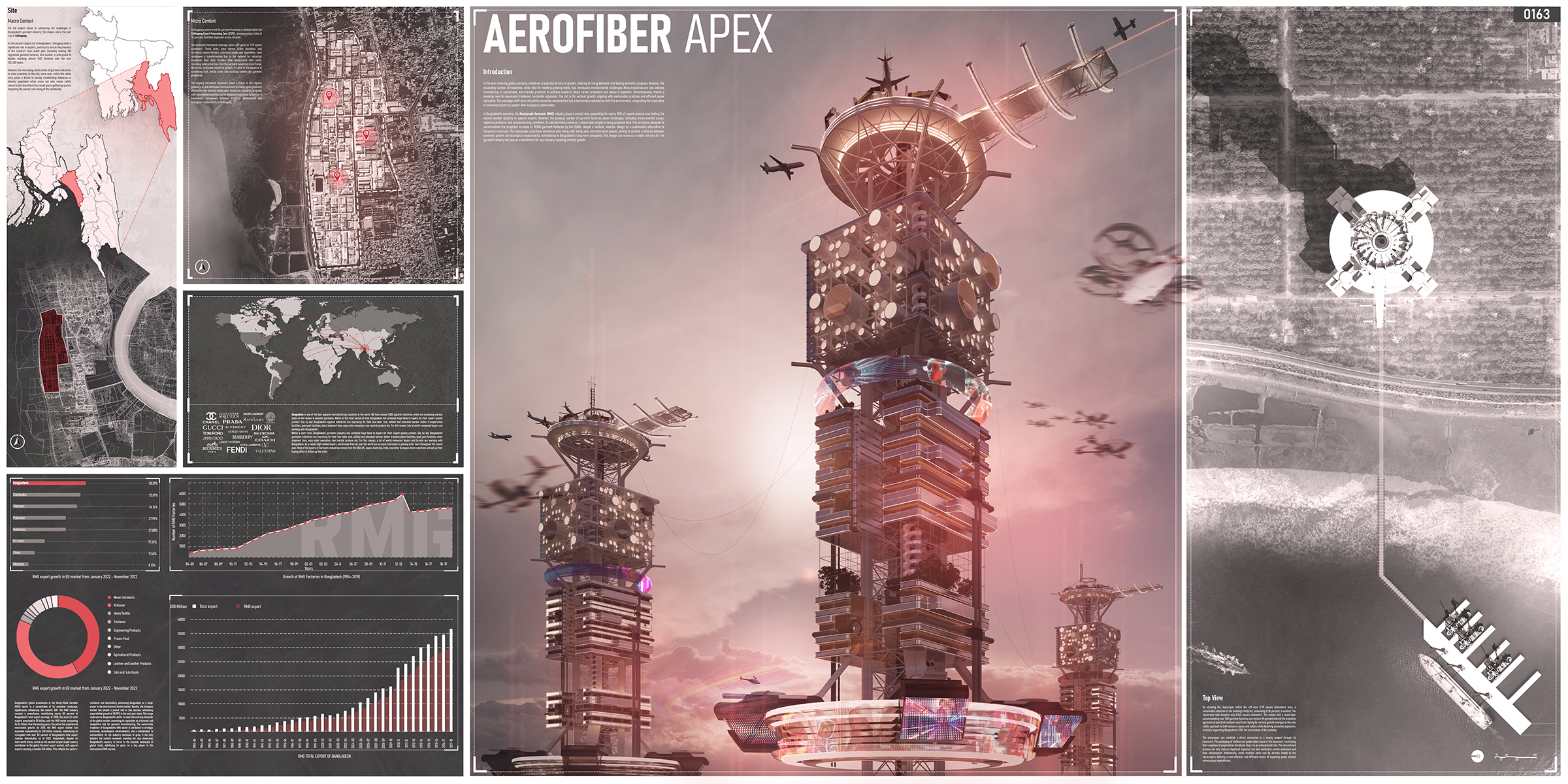 In the context of Bangladesh, the Readymade Garments (RMG) industry is a cornerstone, significantly contributing to export revenue and maintaining a prominent position in global apparel exports. Bangladesh’s global prominence in the Ready-Made Garment (RMG) sector significantly influences the nation’s GDP, contributing nearly 80% of export earnings. From $4 billion in 2000, the RMG sector expanded to $30 billion annually by 2018. As of 2022, Bangladesh ranks as the second-largest single-country contributor to the global garment export market, reaching $45 billion. However, the increasing number of garment factories poses multifaceted challenges, including environmental issues, logistical problems, and concerns about unsafe working conditions. Addressing these challenges, a visionary skyscraper project is proposed in Chittagong, strategically positioned to accommodate the projected increase in garment factories by the 2500s. With its unique housing solutions, such as living pods and common spaces, this design prioritizes the well-being of the staff and adopts a vertical, modular approach to sustainable expansion. The plan aims to balance ecological responsibility with economic growth in order to promote Bangladesh’s long-term prosperity. This design aims to set the standard for any industry considering vertical growth, independent of its consequences for the apparel sector.
