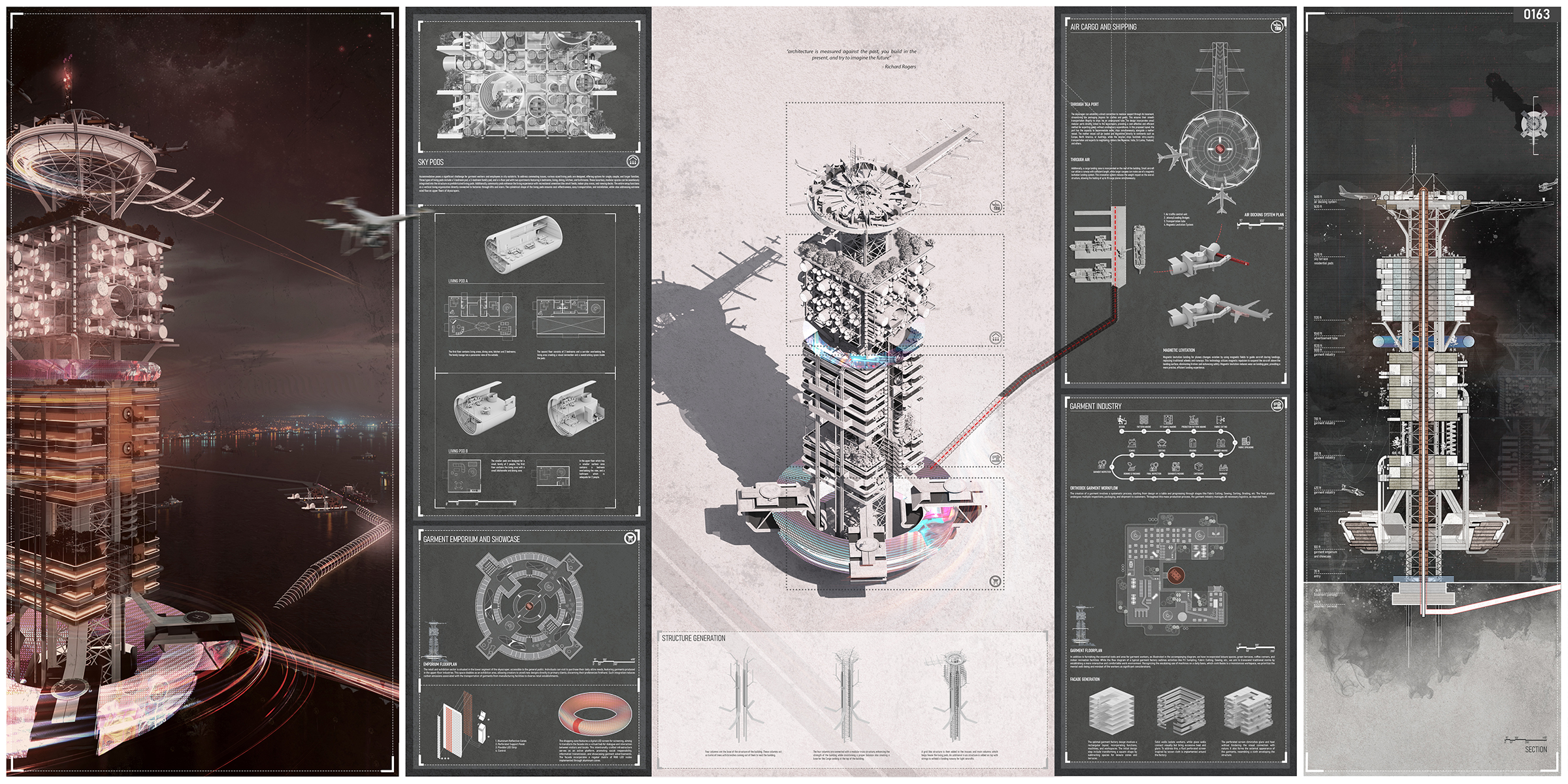 The proposed structure addresses the issue of housing garment workers in peri-urban areas by offering three different living pod types that may accommodate different family sizes. Additionally, communal pods that offer necessary recreational spaces are included in the design. The goal of this networked vertical housing establishment is to improve workers’ general health. The integration of a shopping and exhibition zone acts as a direct link between upper-floor factories and end consumers, facilitating the distribution process and reducing carbon emissions associated with transportation. Considering the skyscraper’s relationship to a seaport and adding an Air cargo docking system to the top shows how it works to generate self-sufficiency, both architecturally and socially. The sustainability objectives of the project are highlighted by this dual-mode transportation system, which lowers carbon emissions and logistical expenses. The story highlights the social as well as the economic advantages, emphasizing the importance of a dynamic and interactive work environment.