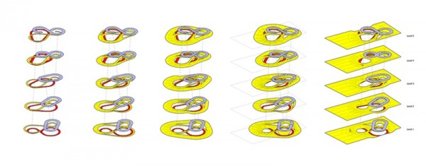 Thus, in terms of plans, each level has a unique spatial quality. The first level is a dispersed spatial arrangement in which the three functional groups are relatively independent while the third level is linear and symmetric, which provides a stronger connection between the three functional blocks. This provides the possibility of a close connection between the performances and post-production. At the same time, in section, each layer has a continuous spatial progressive relationship, which produces a vertical continuous experience. Vertical and horizontal circulation is also integrated in the core. For different types of staff in the building, this design provides three different types of vertical circulation systems by speed: fast, medium, and slow.