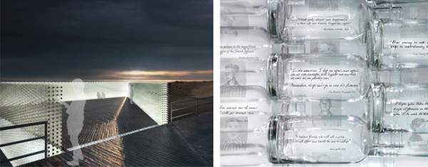 The messages in the bottles are at once personal and universal-the intimate words and faces of the memorial’s “castaways” invoke the Diaspora, while bearing witness to all those that suffered in the Shoah-healing the fragments of history and faith into a collective image of courage and redemption.