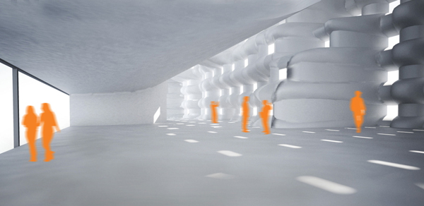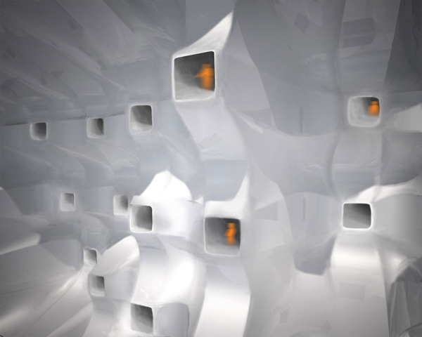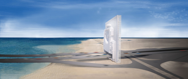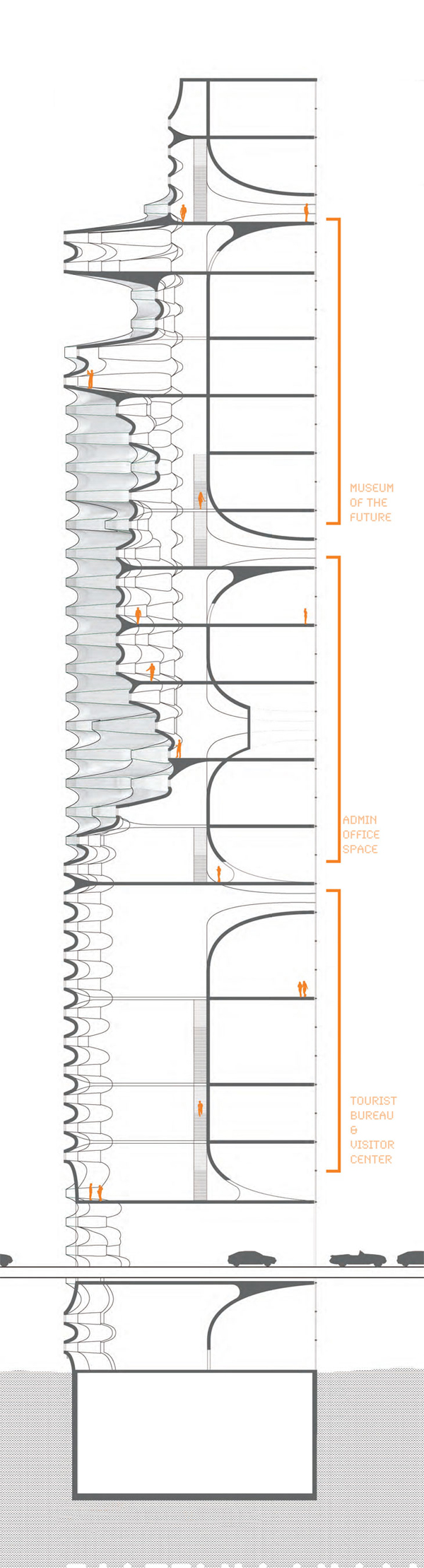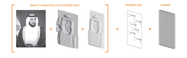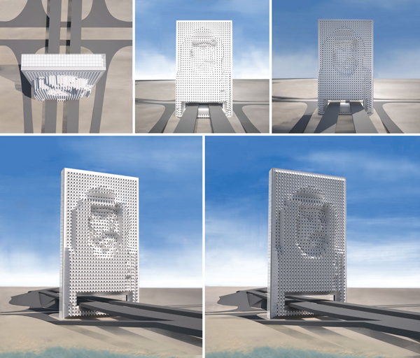 Leah Nichols has designed a “gateway” tower for Abu Dhabi that attempts to both embody and aggravate the idea that architecture is a site for the projection of political power and commercial gain. Taking a cue from the omnipresence of Sheikh Khalifa bin Zayed Al Nahyan’s image, – which is scattered throughout the region on large-scale, American-style billboards – the project embraces the typology of the billboard in order to meet the programmatic needs of a gateway to Saadiyat Island. The proposal considers how a building is perceived by drivers on the highway and attempts to successfully engage viewers through the articulation of a two-sided surface that communicates the single image of Sheikh Khalifa – acting as a site marker similar to U.S. state welcome signage. Made up of 1400 protruding apertures, the building’s exterior skin translates depth onto a second internal skin read from the opposite side or direction of the highway. These double skins, along with a glazing wall encased in structural framing, make up the layers of this seemingly superflat form. The collective layers create an interiorized spatial condition, while the exterior provides visible states of change from multiple directions throughout the day. Therefore, the image typically applied to architecture becomes embedded in the architecture itself.