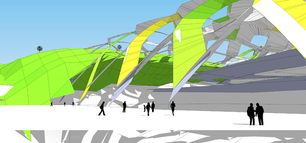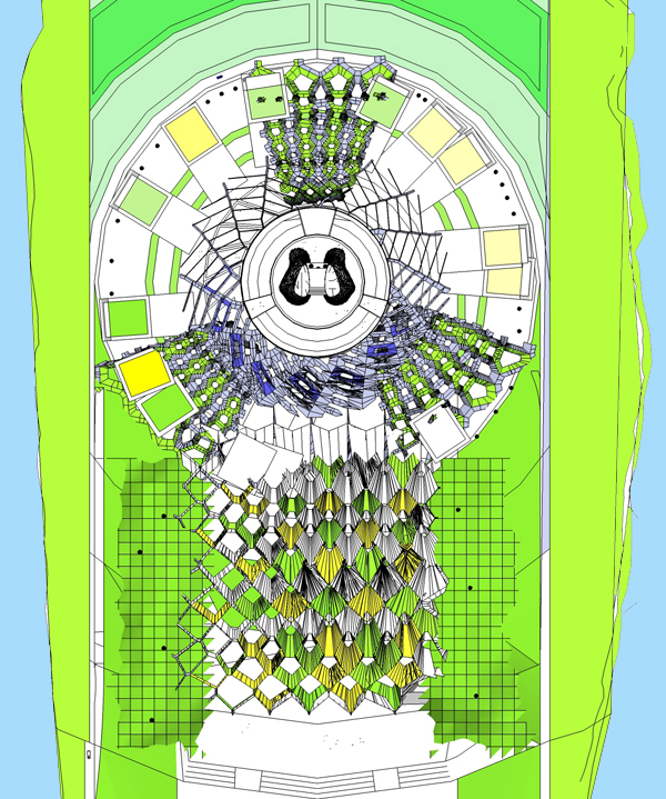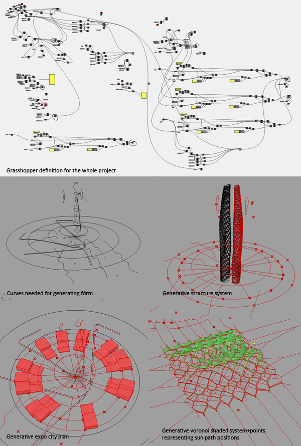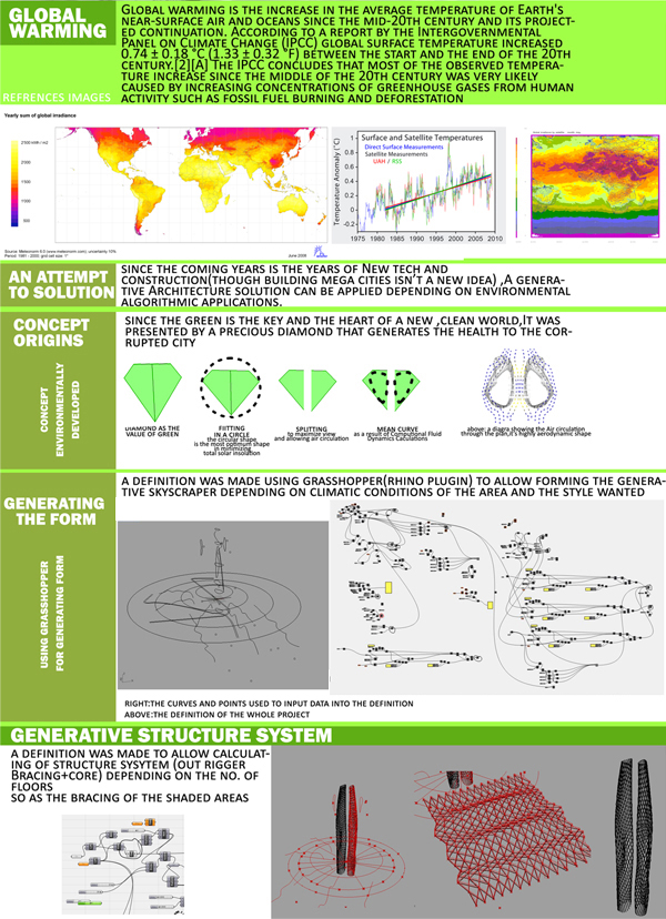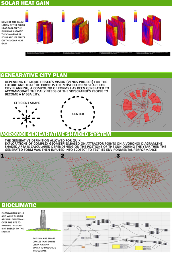 Environmental studies were translated to Grasshopper  to generate the desired form. An analysis of the Sun’s path was used to generate a voronoi shaded structural system while aerodynamic studies were used to design the profile curvature of the tower. Photovoltaic cells, wind turbines, and water recollection systems are some of the green aspects of the proposal.