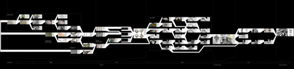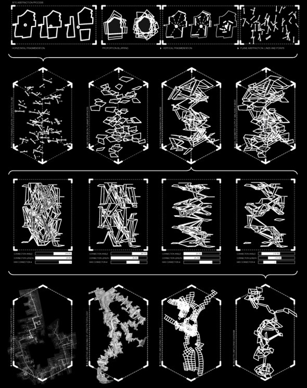 Here, form is achieved through the interrelation and formalization of different variables, labeled as: ‘horizontal fragmentation,’ ‘proportion blurring,’ ‘vertical fragmentation,’ and ‘plane abstraction.’ These variables are mapped across the site to create points of reference which are then extrapolated into lines and planes. These planes, when merged with circulation routes, generate form and space. The resulting spaces are then further manipulated by varying the points of connections between planes with regards to connection degree, length, and overall number of connections. This form is then deconstructed; unfolded, laid out, and related to the urban site.
