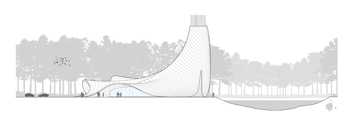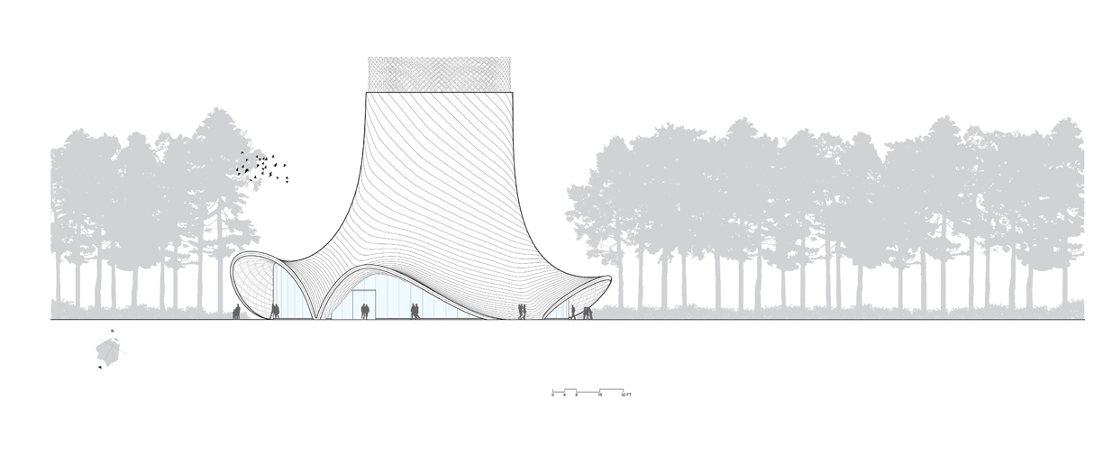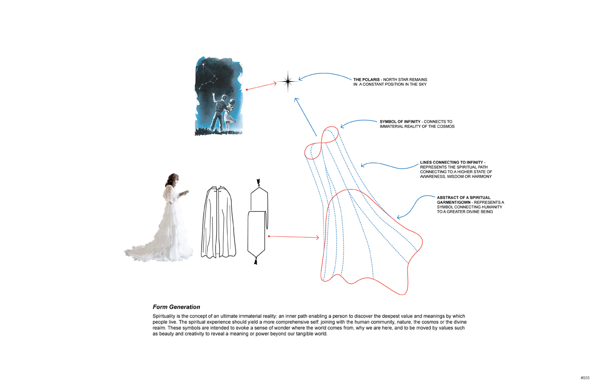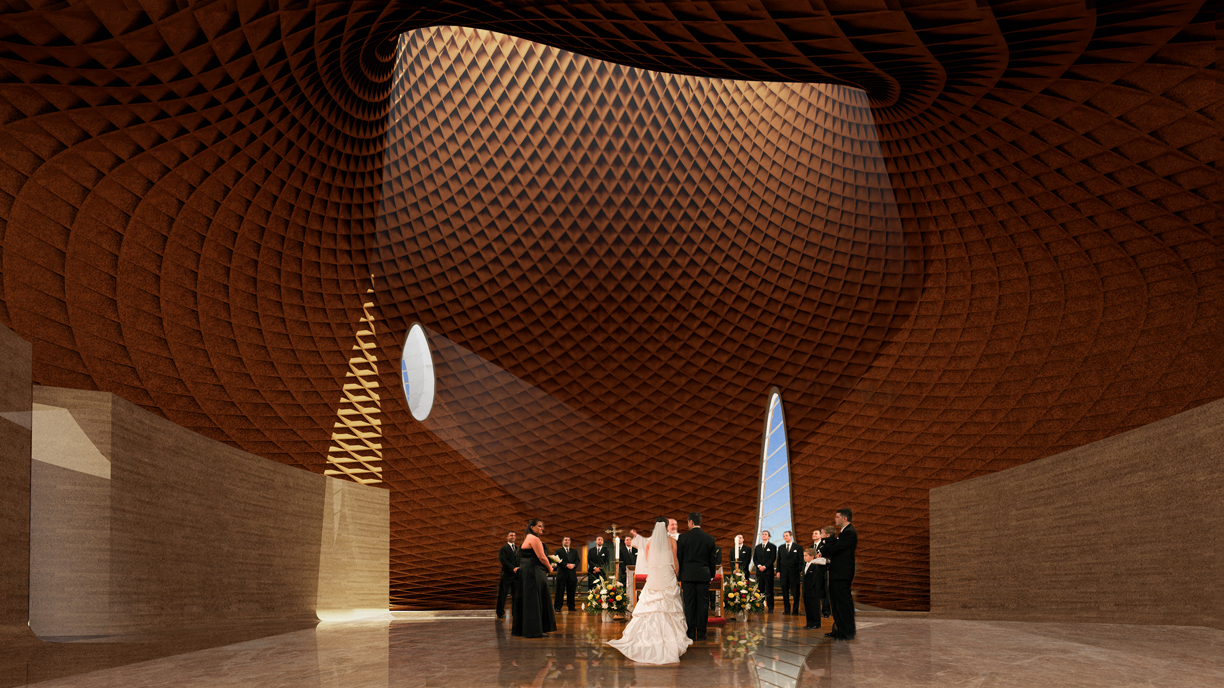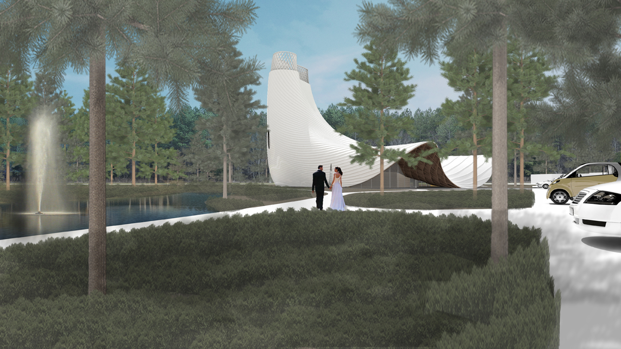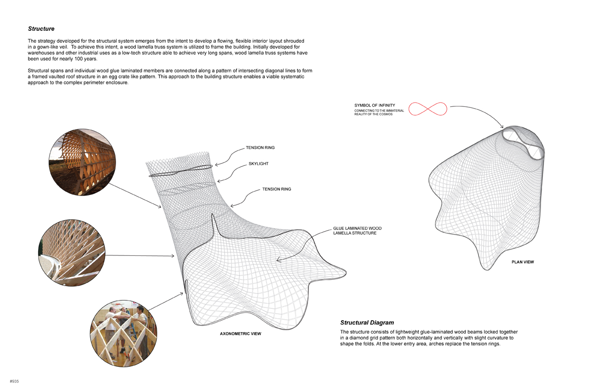 The informal shape of the building footprint symbolizes an allegorical figure, such as Justice, Faith, Hope, Charity, Prudence and Fortitude. The buildings form draws upon references of flowing formal gowns used in weddings and other ceremonial rituals. The top of the building culminates with a large skylight that is shaded by a wooden lattice spire whose form is derived from the symbol of infinity. This combination of flowing natural and cosmic elements results in a unique, formal building while providing a warm interior with soft filtered and reflected light. It inspires an indelible wonder; a dreamlike state of mind that engages the user, heightens their sense of awareness, and brings a deeper understanding to their experience.