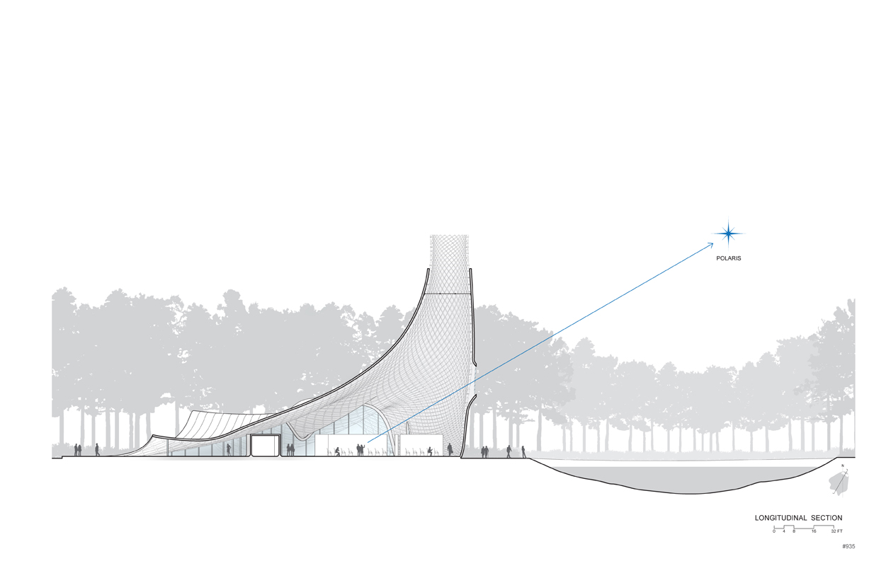 The Polaris, or North Star, is a historically important navigational and otherworldly star. Because of its position in the sky, no matter where you are in the Northern Hemisphere, if you face north you are facing toward Polaris. This direct connection from the sanctuary’s interior to an important cosmic symbol encourages the viewer to reflect and forge a deeper and more meaningful understanding of the fundamental, yet delicate relationships that exist between themselves, our collective cultures, the natural world and its vital resources.