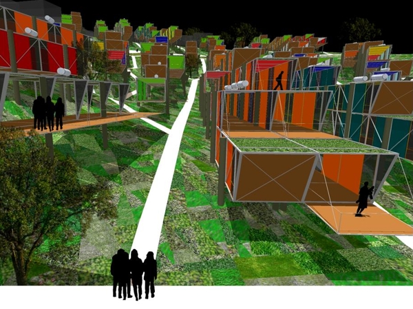 A proposed environmentally friendly housing development for marginalized communities located in the foothills of Betim MC, Brazil by Architect João Diniz solves multiple design issues with a basic structure. Modular in nature the housing stacks on each other to provide improved lateral egress to the outdoors while adapting to the variations of hilly terrain. The CASEXP ecological space unit is a 12×3 meter modular which can be secured to four posts and has a front and back wall section which folds down. The units are designed to stack, providing vertical densities which also allows for the green roof to act as living space. The post foundations minimize ground disturbance and protects against storm water. Placed in a series of clusters to promote community interaction east-west orientation is emphasized to reduce solar heat gain.