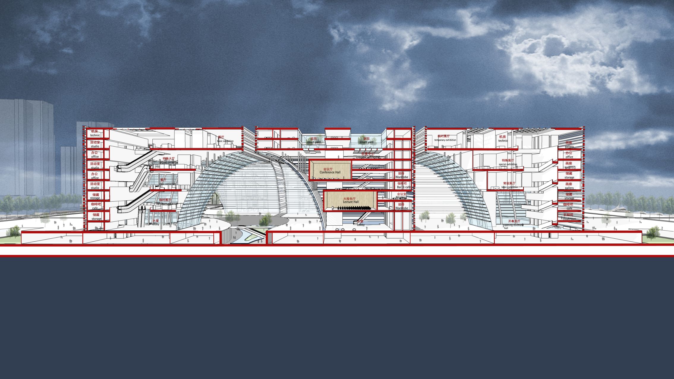 The design reflects elements of Changzhou’s southern Chinese culture and the city’s prominent water features. The building modules – which cantilever bridge-like in a large arc – consist of six 45 metre-high pavilions which vary significantly inside with their different architectural functions, but form a visual whole from the outside. The space between the art gallery to the east and the science and technology museum to the west forms the public plaza in the center of Changzhou. With its water features and generous landscaping, it provides an inviting ambiance and serves as a meeting point in the district.
