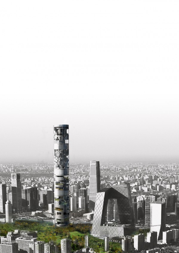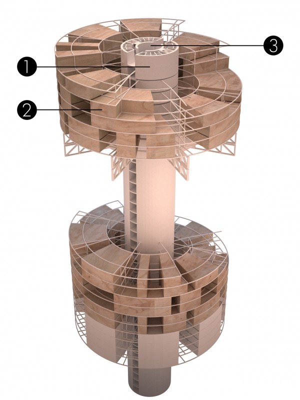 The project has two different parts: the permanent one and the mutable one. The vertical communications and facilities core (1), and standardized and mobile parts (2) on the other hand. An elevator inside (3) is in charge of transporting these prefabricated modules into their places inside the building, which are trucked from the factory. We can say that is the first proposal in the world of a “supertall” built with prefabricated modules, making it a flexible and versatile building. Betting into the future field of industrial architecture. This idea was the winner of the construction category of the competition.