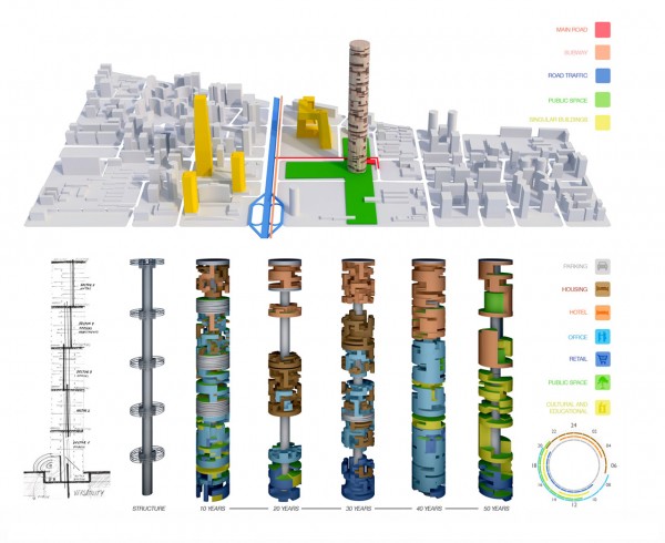 The most innovative architectural idea of this project is based on the possibility of a constantly changing skyscraper. It is all about developing a mutant vertical city building possibility, which answers to its time, place and inhabitants requirements. NODO project becomes much more than a skyscraper, it is a collective creation, a gauge, an urban infrastructure which evolves during its existence and adapts itself to its environment, receiving many functions and needs such as housing, offices, commercial and public spaces.