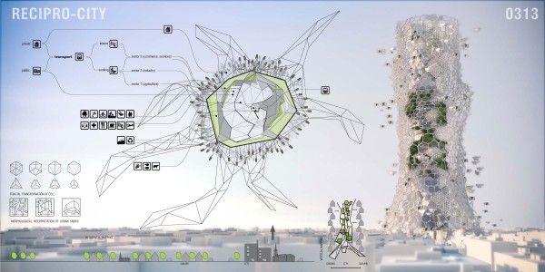 The main idea of this proposal is to create a skyscraper that could be defined as a city by itself. It combines the density and vibrant life of the contemporary city with the tranquility of the suburbs. The central part of the structure is conceived as the city, where offices, commerce, entertainment, and transportation areas will be located. A spiraling system of vertical transportation will communicate all levels without the need of cars. At the edges of the structure the residential units will be located. These units are large and resemble life in suburbia; some of them will even have outdoor gardens overlooking the city.
