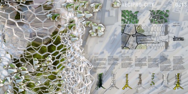 The Skyscraper structure is made out of a concrete and steel core while the structural skin is primarily steel frames that follow a cell-like pattern that allows for large spans that accommodate the residential units. Larger openings will be used for recreational parks and other recreational areas.