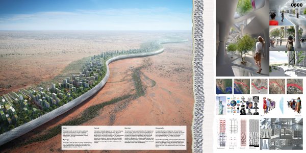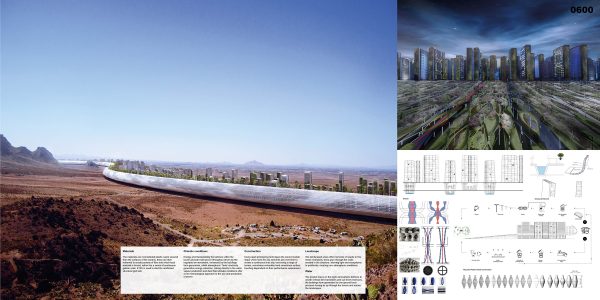 The project draws on the night atmospheric defense to create vertical dew harvesters and sub-level reservoirs, the building’s form generates its own ground force pressure forcing air up through the towers and across the landscapes.