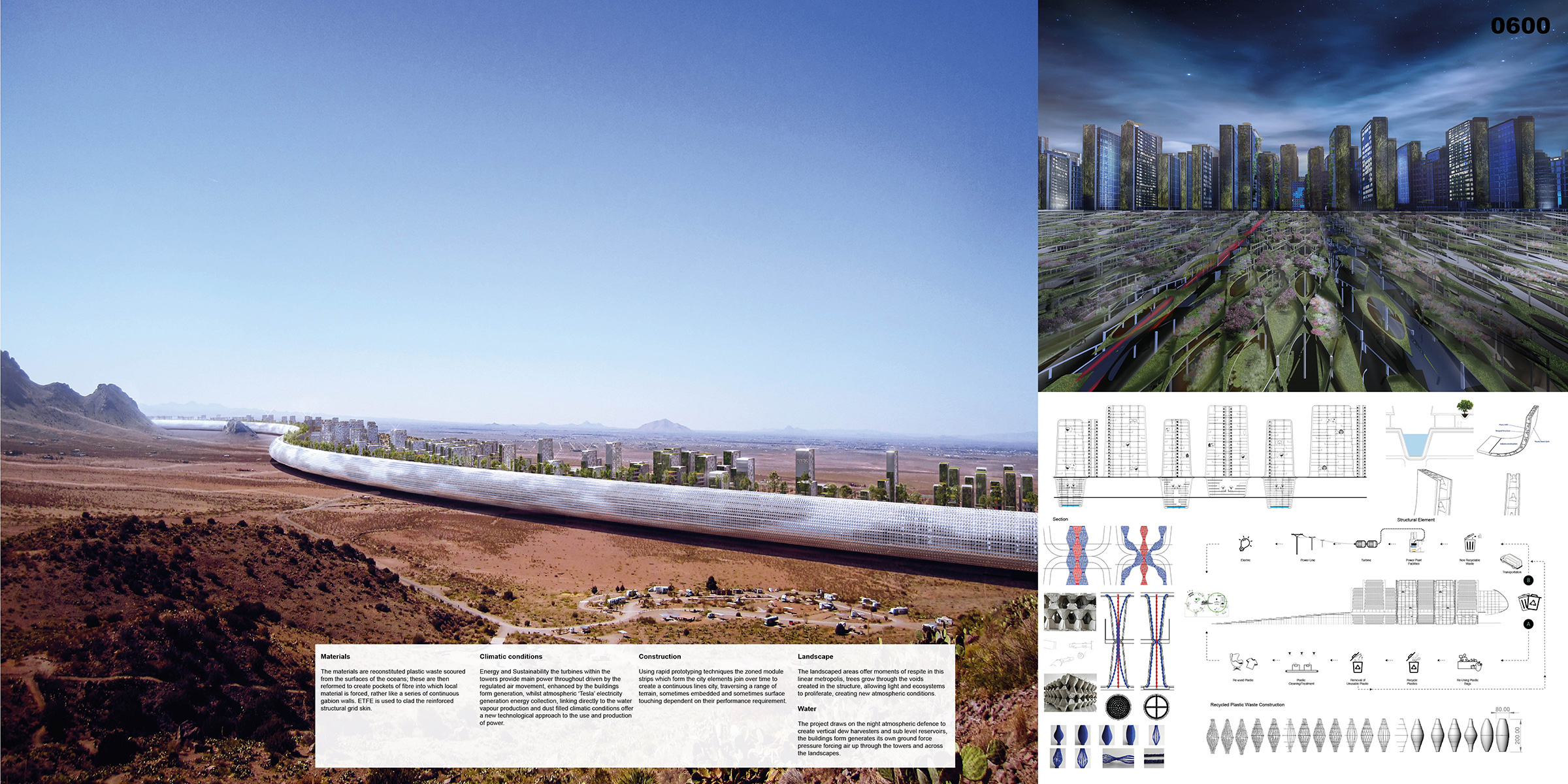 The materials are reconstituted plastic waste scoured from the surfaces of the oceans; these are then reformed to create pockets of fiber into which local material is forced, rather like a series of continuous gabion walls. ETFE is used to clad the reinforced structural grid skin.