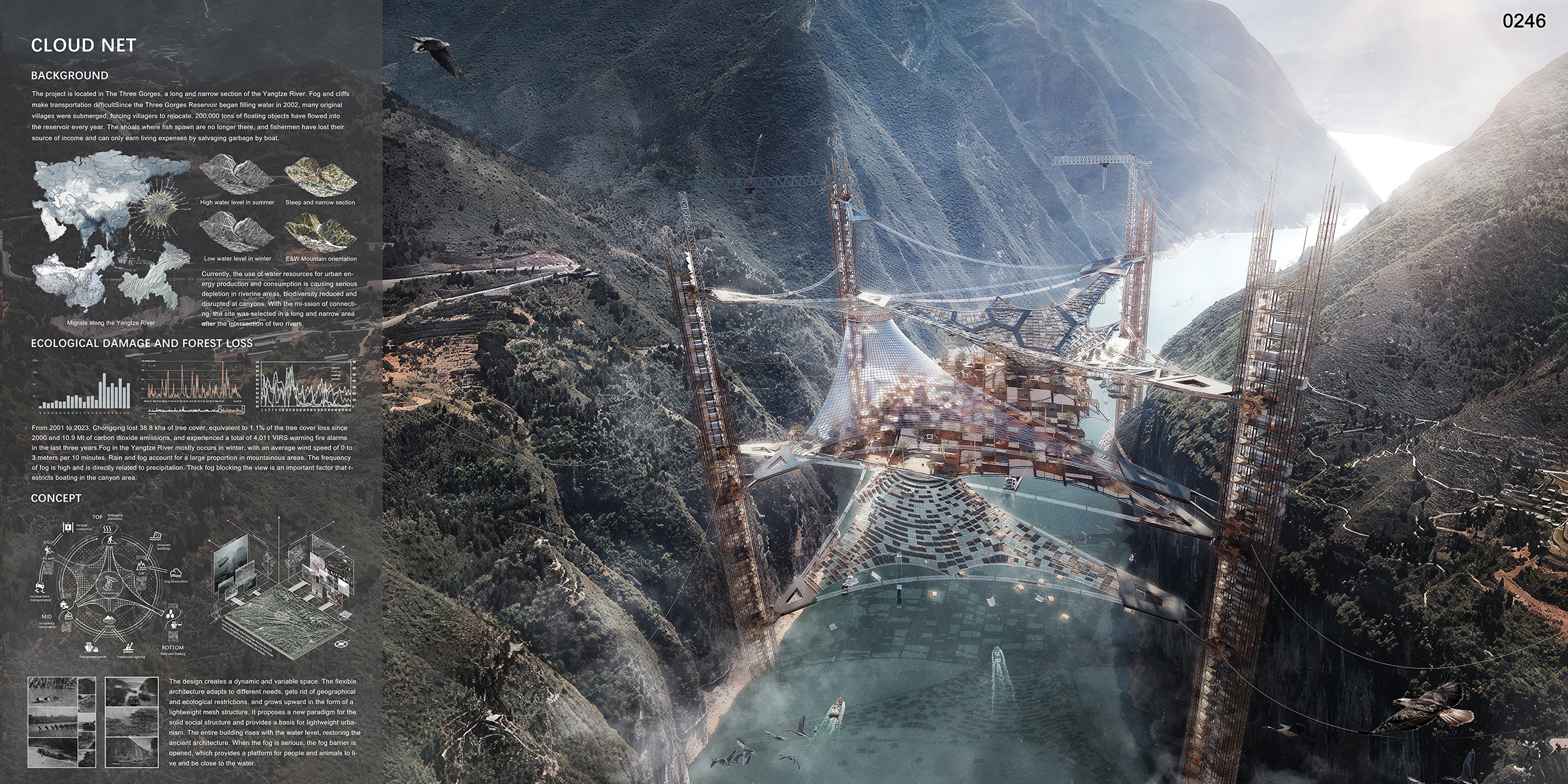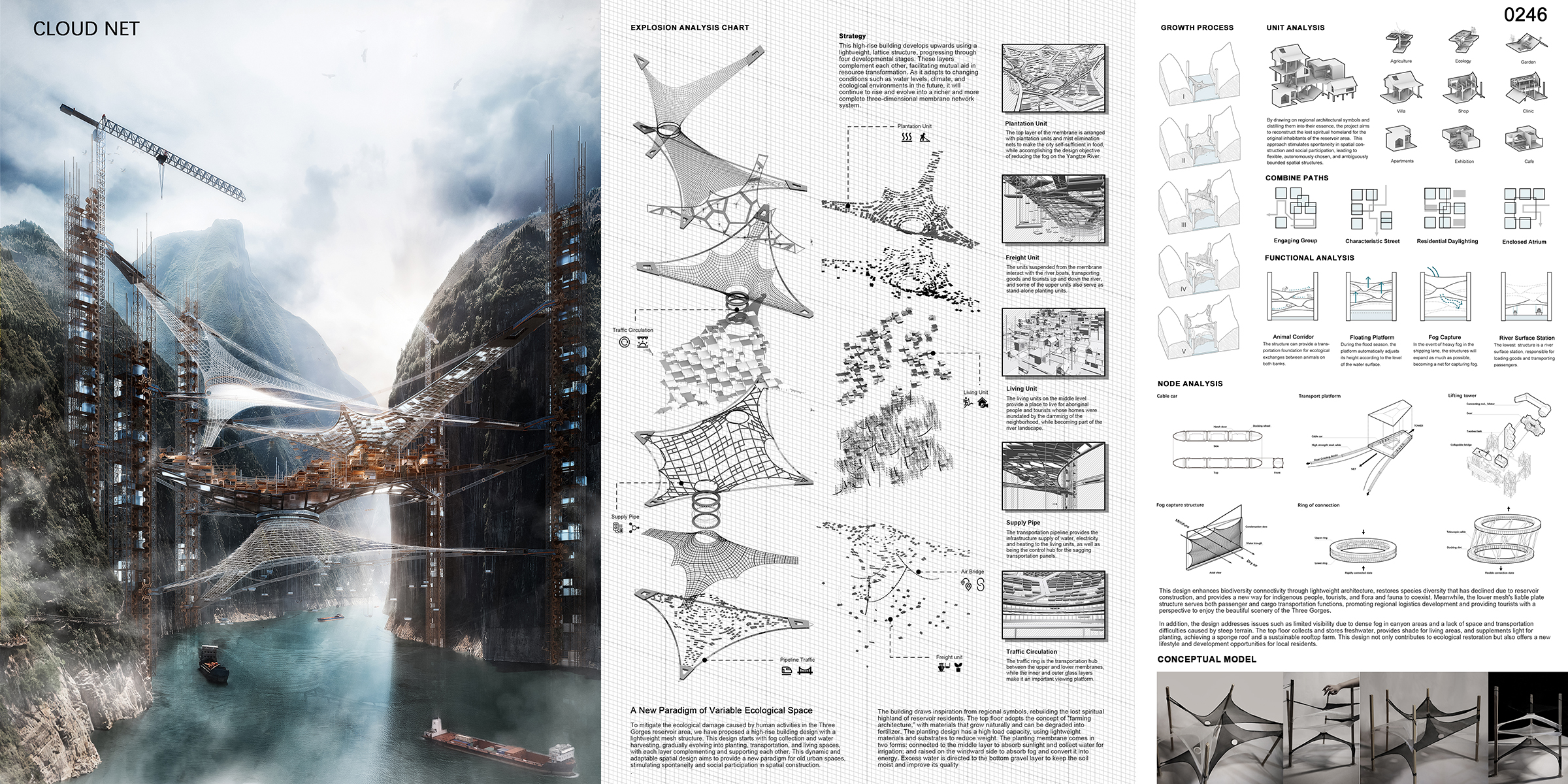 To mitigate the ecological damage caused by human activities in the Three Gorges reservoir area, we have proposed a high-rise building design with a lightweight mesh structure. This design starts with fog collection and water harvesting, gradually evolving into planting, transportation, and living spaces, with each layer complementing and supporting each other. This dynamic and adaptable spatial design aims to provide a new paradigm for old urban spaces, stimulating spontaneity and social participation in spatial construction.