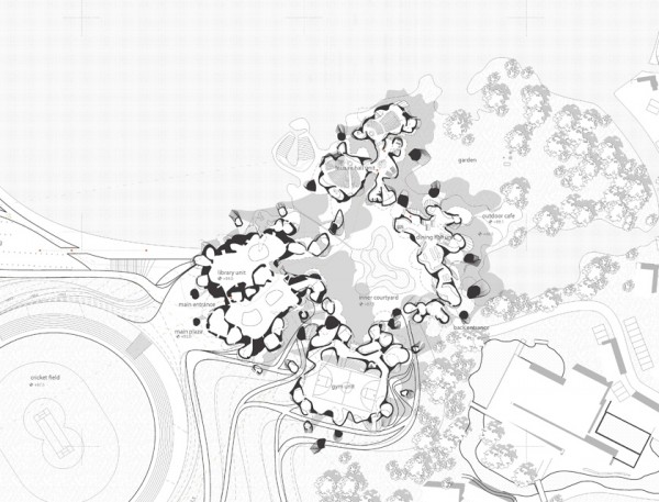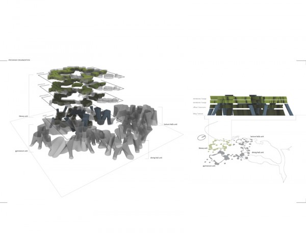 The program avoids dead zones, as each function is distributed in every unit in a modified ‘mixed use’ strategy. The major common spaces, the library, the gymnasium, the dining hall and the lecture halls, characterize each unit/lobe and are located on the ground floor. The ground floor extends vertically through the volume, to bring light into the space, and to visually and physically connect the levels, emphasizing the vertical connections. The second level determinates the horizontal connections between these units, and hosts the educational and administrative parts. The two top floors are reserved for the dormitories which have direct connection to the ground through the annexations.