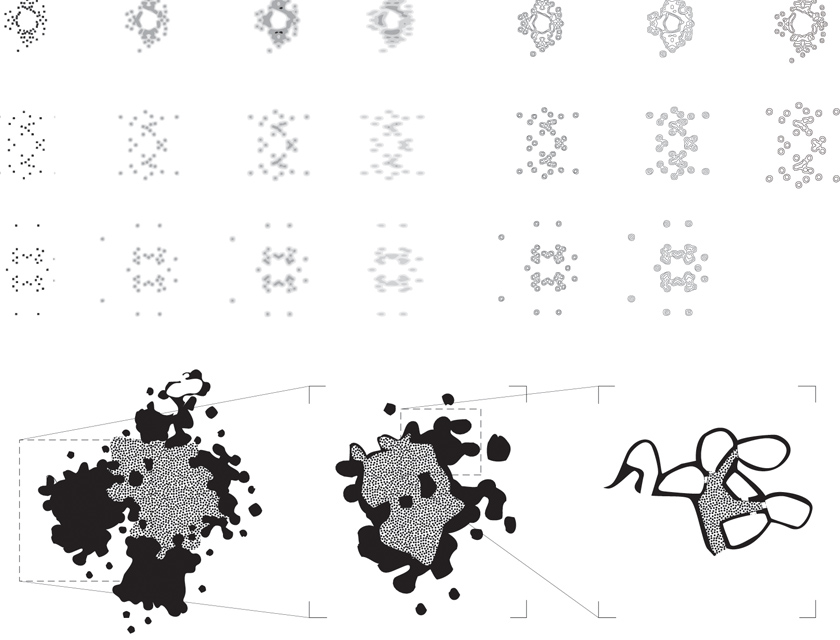 The project deals with the variation of density of an abstract substance that describes the mass: the aim is to break down and spread a homogeneous mass composed of particles in order to create various spatial conditions. A geometrical transformation was used as a tool to articulate the inversion of density. There is a clear intention to create a compact but penetrable mass, generating a multitude of effects. The building serves as both a border and a link between the adjacent housing development and the surrounding context.