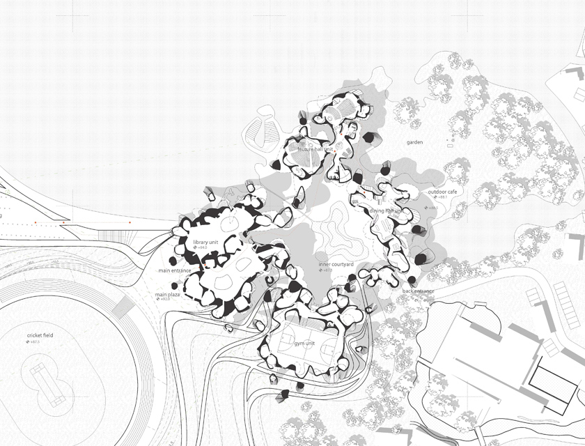 The character of the transformation process is to define a centralized organization in different scales which we translated in common central spaces/ smaller service-private rooms. The building is a link that interacts with the forest, the lake and the open field. The site has three main access points; the main entrance is framed by the Cricket field and the bordering lake edge, which rising up to the main plaza, the forecourt to main gate of campus. The second access is located between the building mass complex and the sport fields and delicately redefines the horizon. Finally the third access is reserved for the service. When approaching the campus by car, the first impression of the building is foregrounded by the lake, reinforcing and defining itself as a stable institution. Once you are on the site, the building is perceived softer as it is embedded in the landscape and merges with the forest.