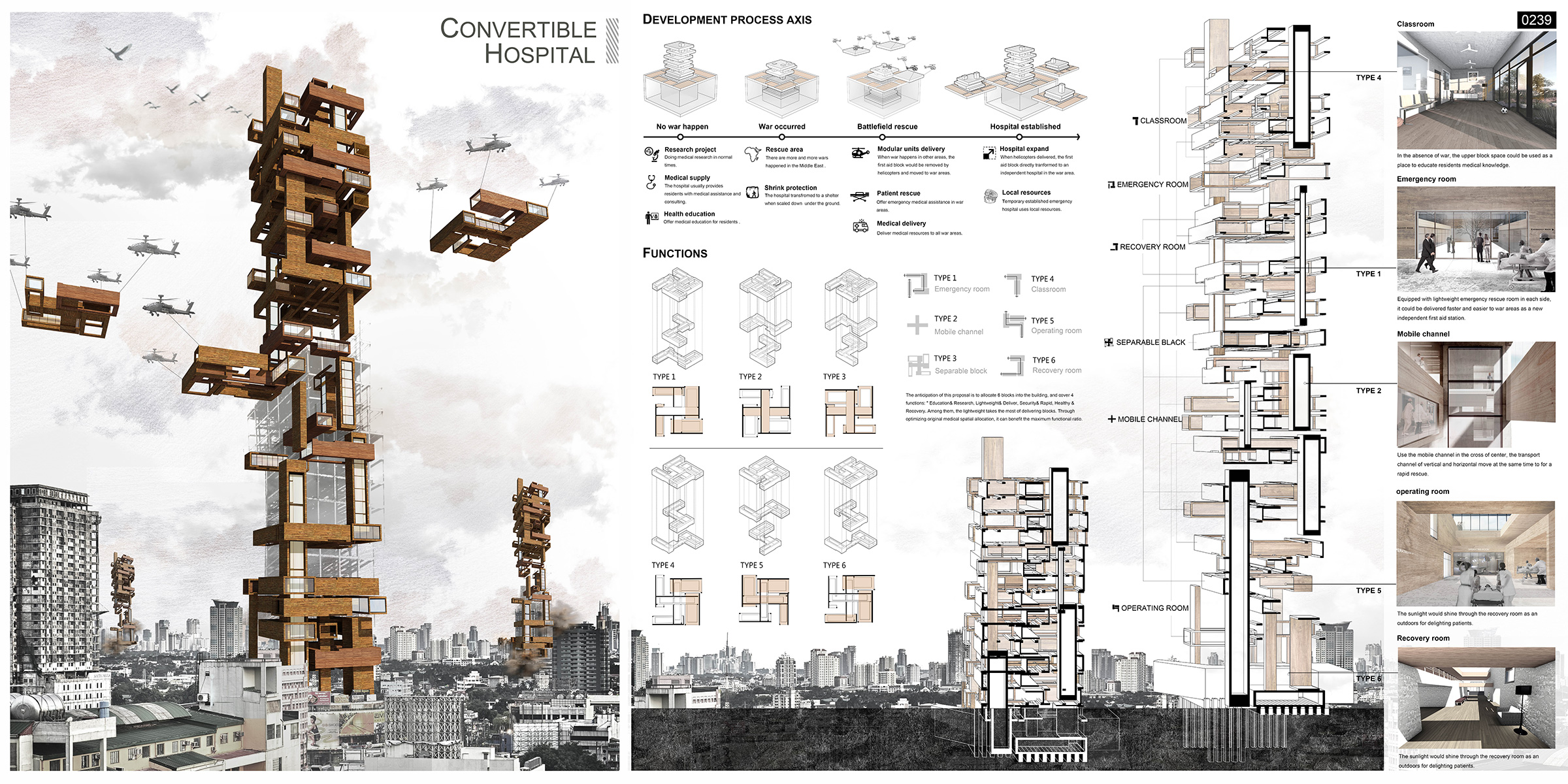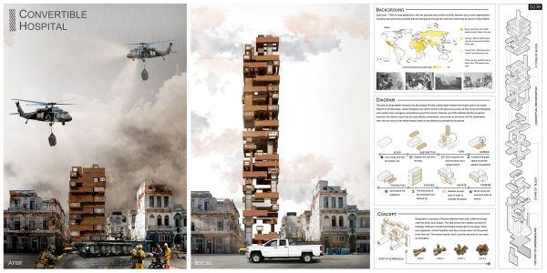 Overview of ” Convertible Hospital”, the design concept is to create a building rapidly delivering medical resources within the shortest possible time and giving the 1st aid. Then we can efficiently save and attend to injuries from wars.