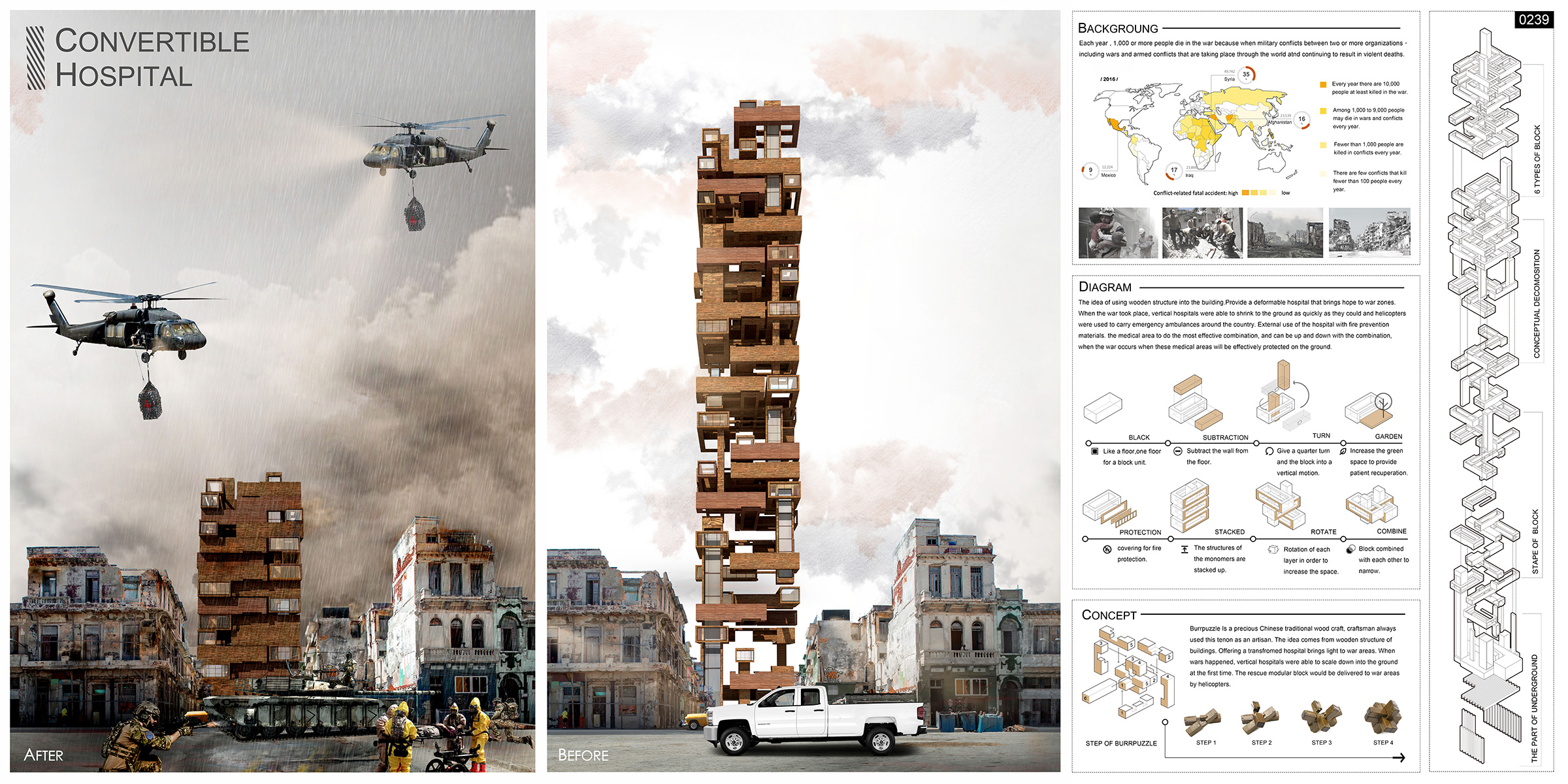 Normally this hospital provides medical innovation, medication, and education. When war broke out, the purpose of the convertible hospital must be for the sake of peace, save war victims and provide EMS by helicopters and drones during shrinking. We can shrink and transform the building volumes from dividing space into those channels to connect up and downstairs, and create open spaces. it’s making of fire prevention materials and duplicate volumes by plus, rotate and assemble. Using the wooden construction of the traditional burr puzzle to shrink buildings efficiently. With the transformed prefabricated hospital we can better off displacing war victims and educate those habitats for war areas.
