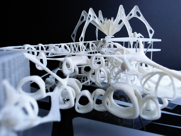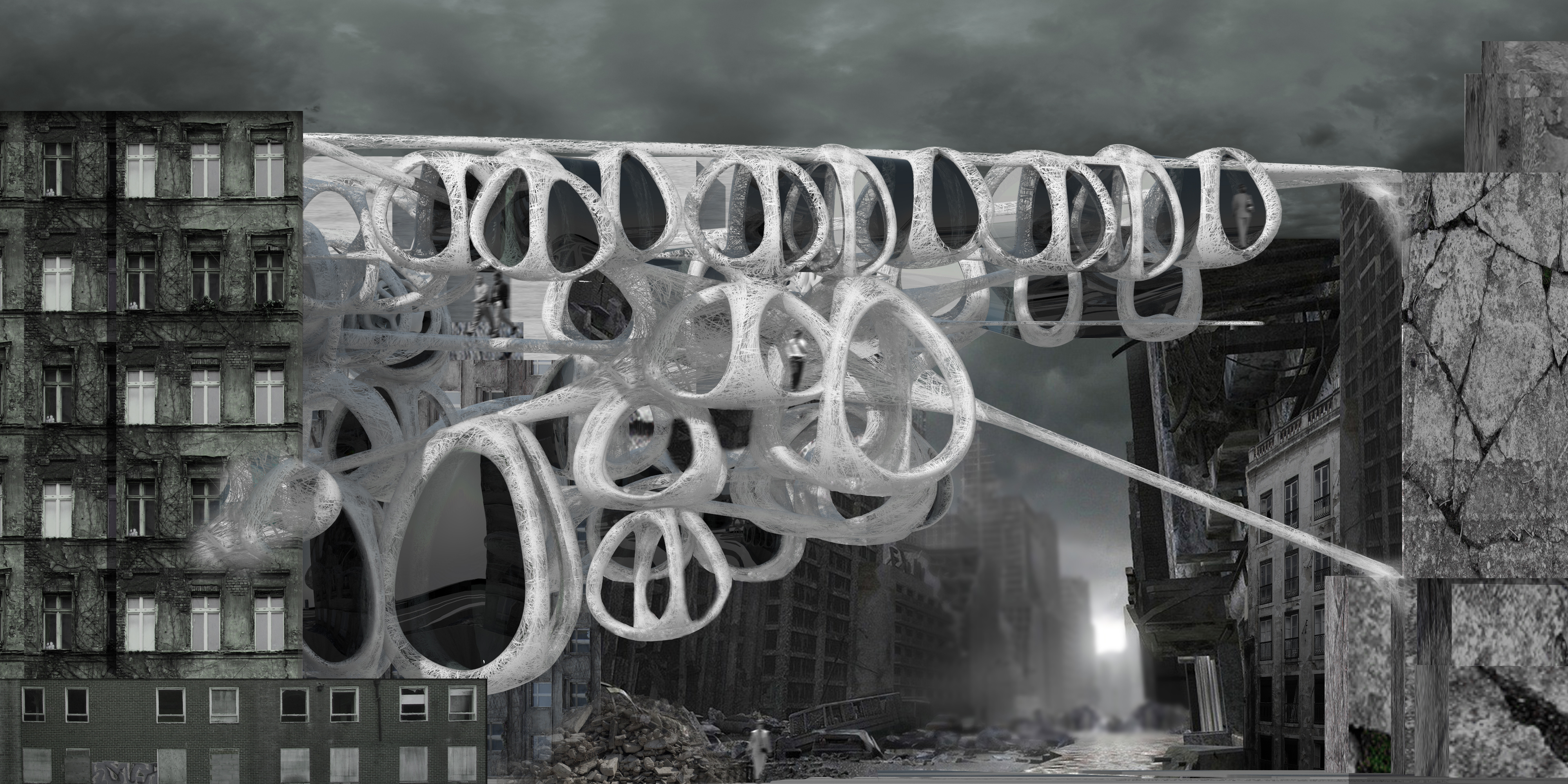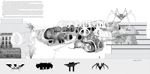 What emerged was a new strategy in the toolset of disaster housing, but more importantly evolution. A swarm of robotic spiders, called the “Arachne” were created to fly to devastated cities and build nests of housing for displaced residents. Using the logic of a 3d printer, the Arachne deposit strands of material, including Carbon Nanotubes, Porous Alumina, Nanogel, and Micro-Encapsulated Phase Change Material (MPCM), generating emergent solutions that can be rapidly fabricated with minimal macro-scale details. The Arachne understands two fundamental building types, the suspended unit, and the nested unit. Suspended units are hung from a lattice of spun structure while the nested units are built into existing infrastructure that is salvageable. The structures generated are thus a synthesized byproduct of their environment.”