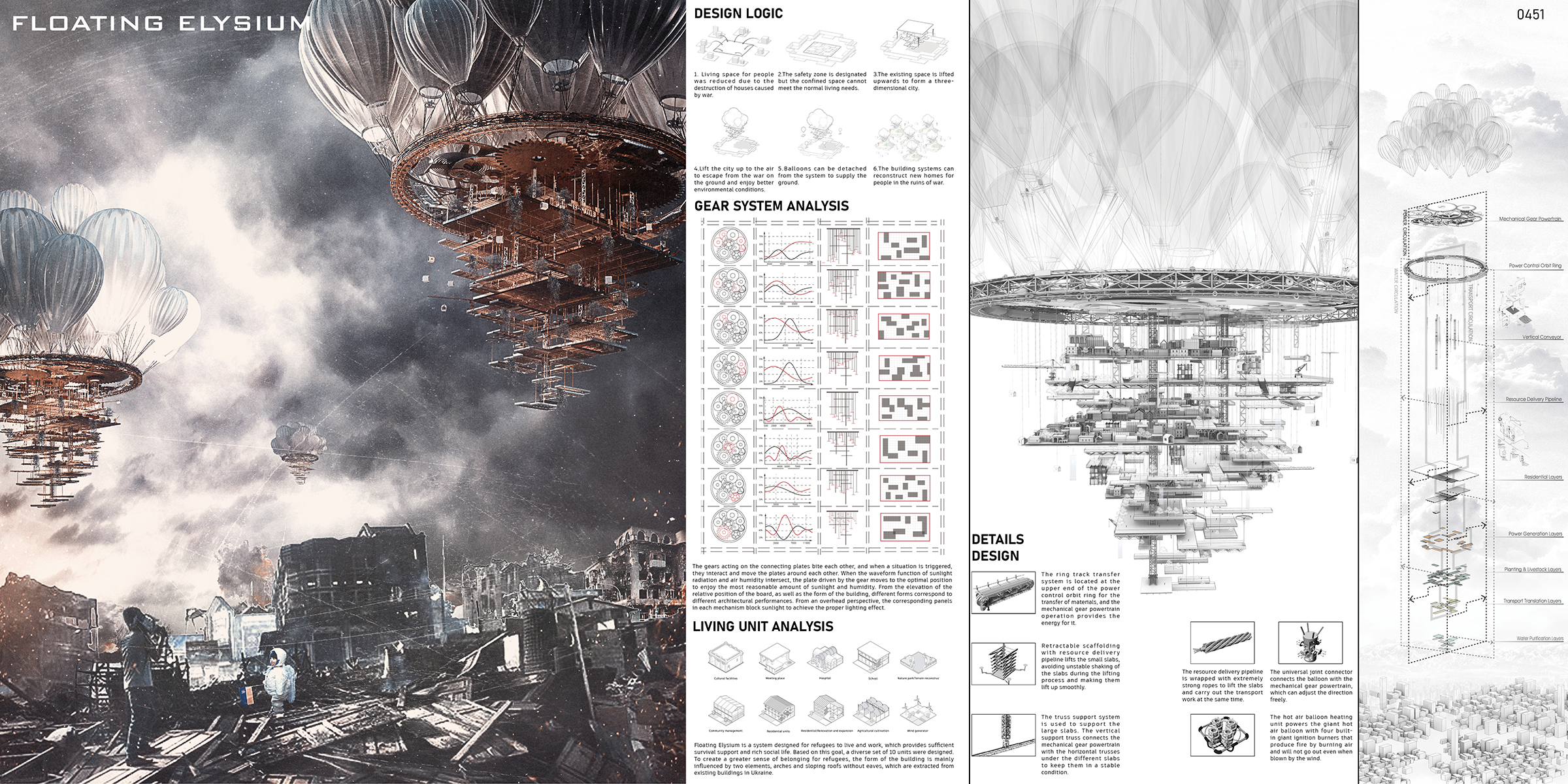 With the destruction of the original farming and urban land, we centralized the agricultural production units and the residential and commercial building units and organized these units into a monolithic structure by means of suspension cables and structural supports. A large number of hot air balloons on top will lift the building up to the sky. In addition, small units around the constructions can land on the ground to enable the exchange of materials and provide productive resources for post disaster reconstruction as well as the renewal of floating clusters. Floating Elysium is a dynamic, new postwar homeland that complements Kiev city.