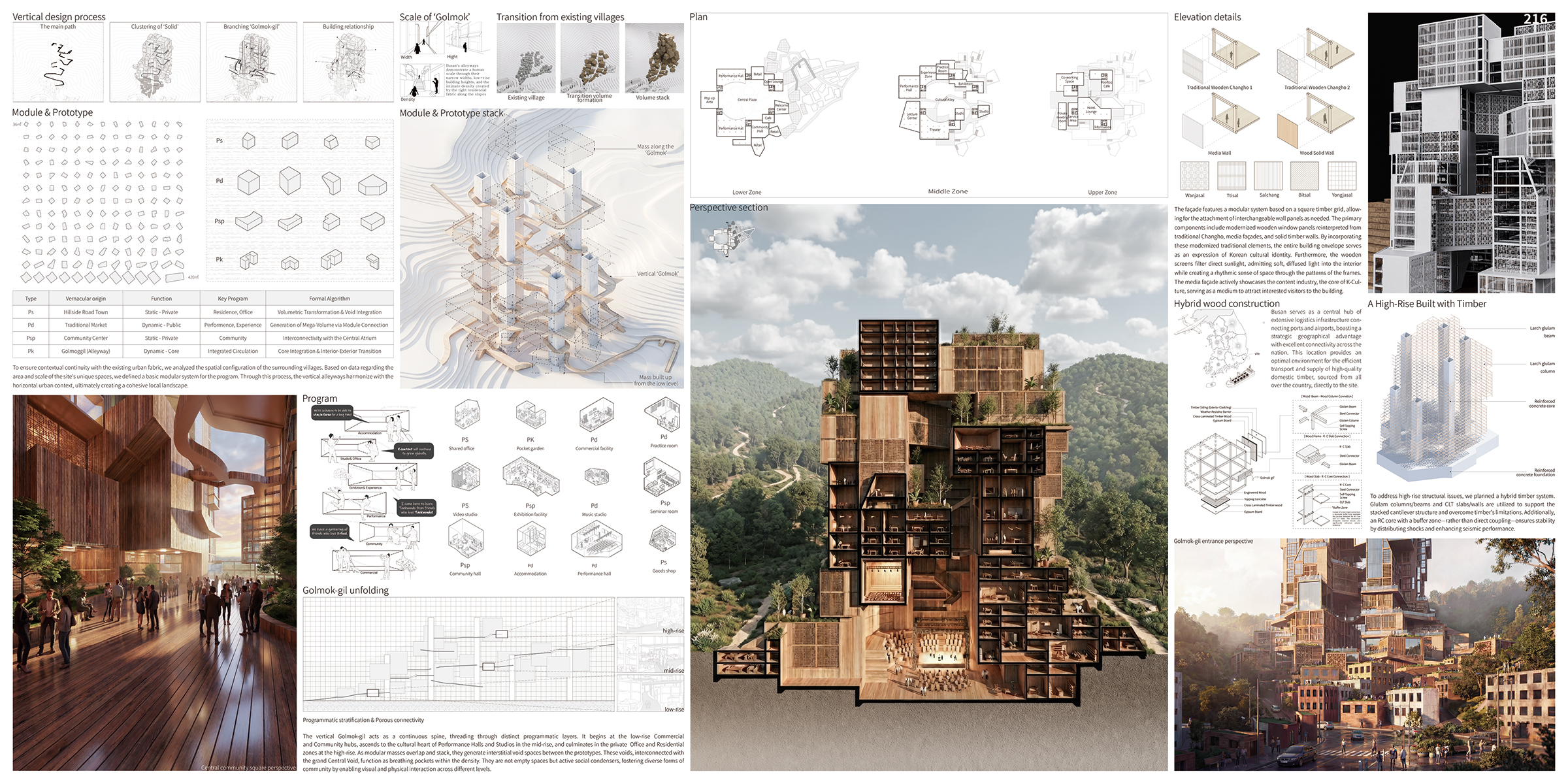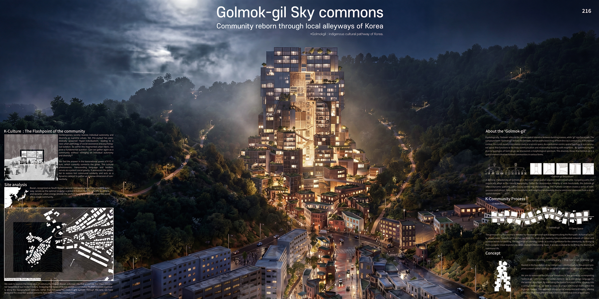 Through a deep analysis of the spatial processes that fostered community life in this specific site, we identified the “Golmok-gil” (traditional alleyway) as the essential spatial archetype. The Golmok-gil was not merely a thoroughfare for passage; it was the living room of the city, the capillary of social interaction where the community was woven together. Based on this finding, we propose a radical reinterpretation: translating the spatial typology of the horizontal Golmok-gil into a vertical dimension. This project challenges the limitations of the ground plane, offering a skyscraper that generates a new form of community culture through vertical expansion.