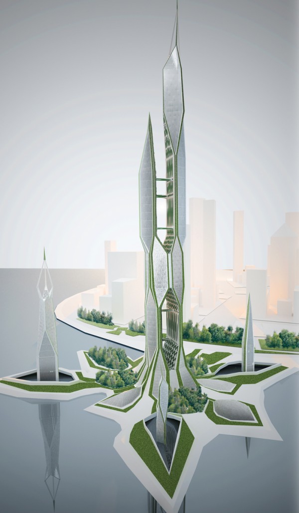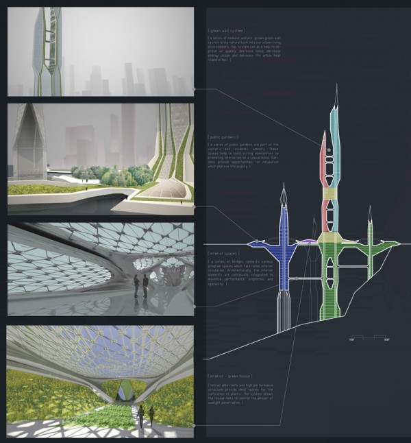 The Horti-hub is a mixed-use water purification skyscraper proposed for New York City designed by Philadelphia architect Zhongshi Liu. The complex consists of five independent towers dedicated to different programs. The taller structures will contain residences and offices while the three smaller ones will be used as research center, cultural center, and water purification plant. At the ground level, a continuous greenscape unifies all the structures and will be used as a new public park to the city.