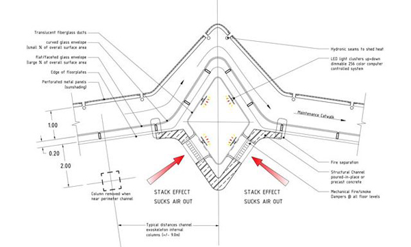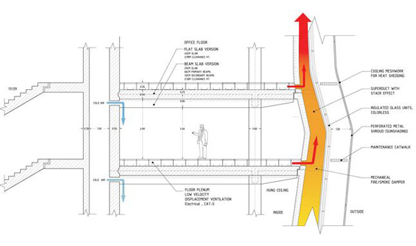 The duct work is allowed to migrate out of the central core towards exterior and the glass envelope, wrapping the building, starts to take on duct behavior by de-laminating, in order to create pleats to enable air flow. The pleats branch and run across the building facades, linking to floor plenums on each level at several points throughout the perimeter of the building. Hot air rises, due to stack effect, and the building is passively cooled. The second layer, made in perforated metal sheets, acts as a sunscreen during the daytime however allowing the views through.