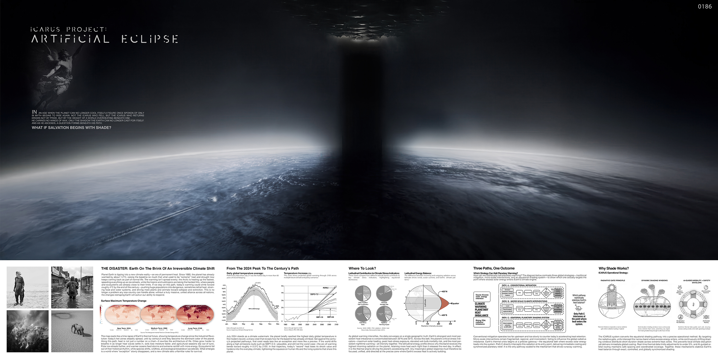 This project introduces a new architectural typology: Skyscraper as Atmospheric Infrastructure. Icarus does not occupy land in the traditional sense. Instead, it inhabits the thermal layer between the Earth and the upper atmosphere where solar influence is strongest and climate impact is most effective.