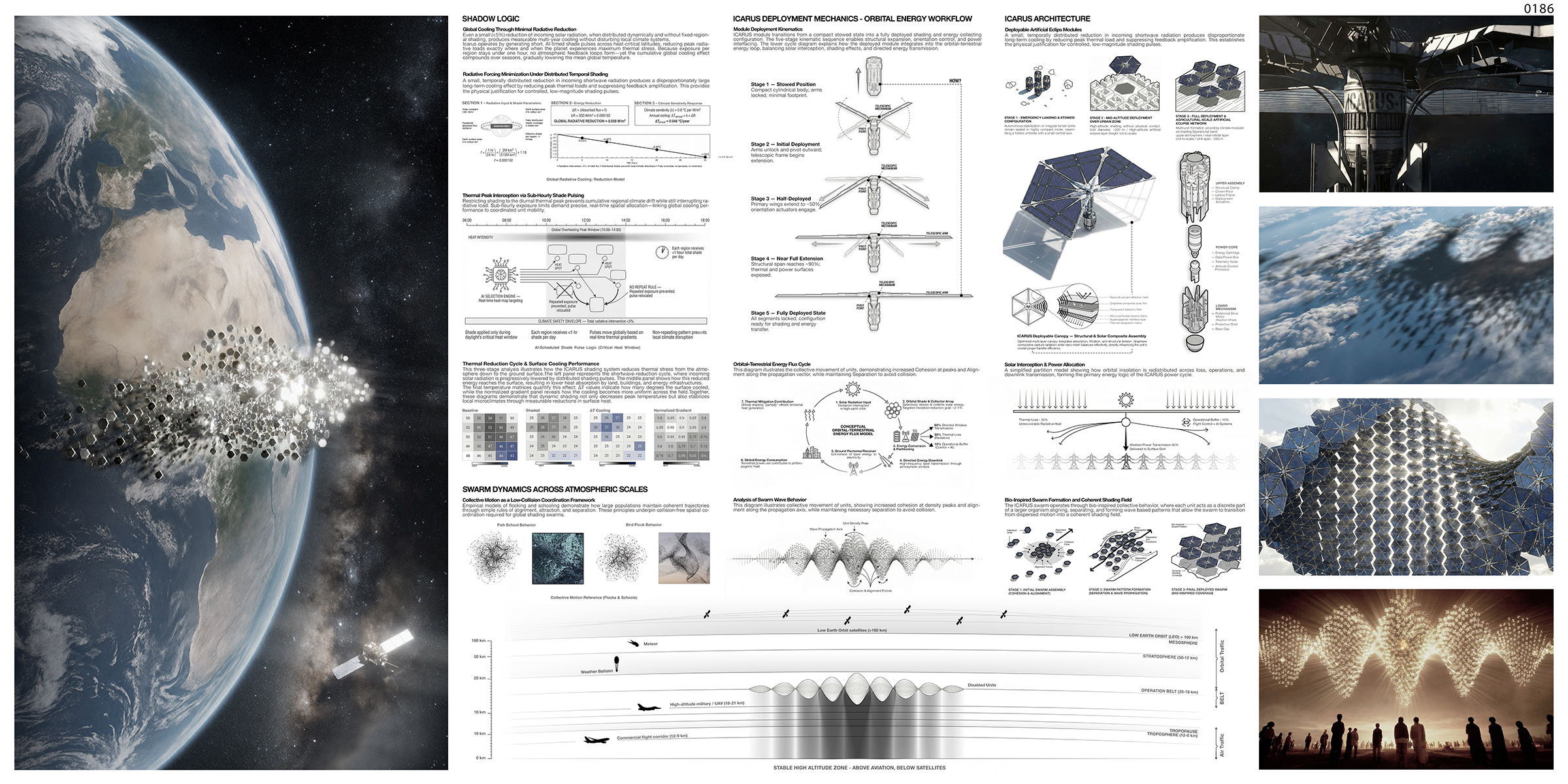 As rising temperatures, prolonged heat waves, and overstressed urban energy systems push cities beyond their limits, Icarus proposes a new kind of vertical intervention. It reimagines the skyscraper not as a fixed object but as a functional atmospheric column made of hundreds of lightweight autonomous units that operate 18 to 20 kilometers above the ground. Together they create a drifting, cloud like shading field moving across the sky.
