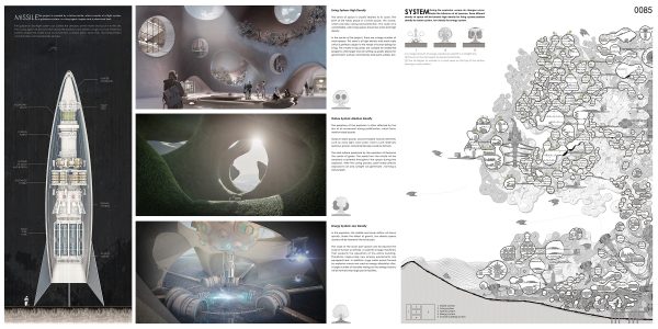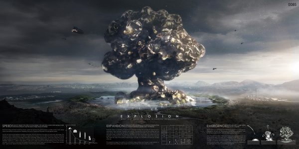With the development of society, the requirement of architecture is getting higher. Human beings pursue faster construction, larger building scale, and more diverse space. When the technology develops to a certain level, how can architecture form on a larger scale with complex spaces in lesser time? The proposal assumes that in the future, large-scale buildings can be triggered by long-range missiles. In such a process, a large number of materials solidify to form a series of spaces spontaneously. The project aims for a manifesto of a megastructure by the explosion with three main characteristics.