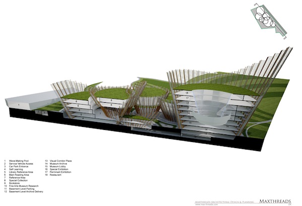 Recently Maxthreads Architectural Design and Planning from Edinburgh entered an international architecture competition for the design of a new City Cultural Centre in Taichung, Taiwan. The Taichung City Cultural Centre, Public Library & Fine Arts Museum will define the northern arrival gateway to Taichung Gateway Park, providing a public hub to the overall master plan.