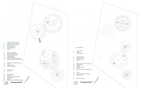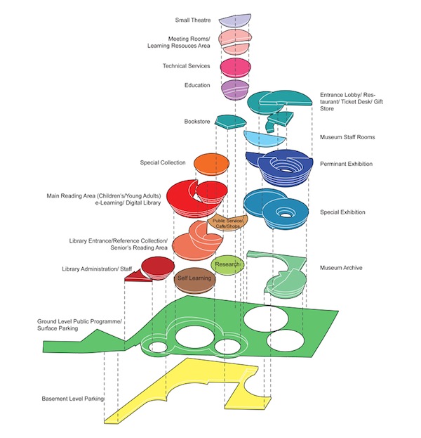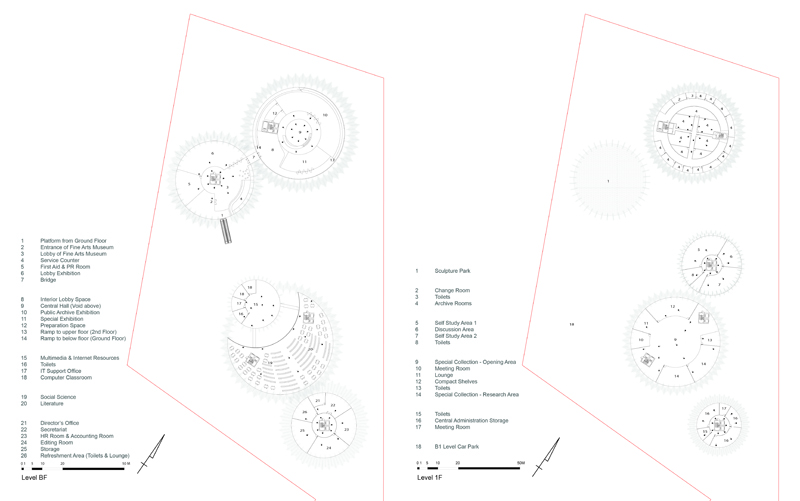 The vision is to create an unconventional and exceptional gathering space for visitors and inhabitants, animated by public program. The concept of the “Taichung Inverted Cone” incorporates interactive, mixed-use public spaces, recreating boundaries between each program, while defining a new typology of Library and Fine Arts Museum. The architectural expression for Taichung’s City Culture Centre—”Galibrary”— has been inspired by the uniquely beautiful mountain-scape of Taroko Gorge National Park, Taiwan. Designing from their dramatic multi-level void spaces, these landforms establish a gateway to landscape beyond. Maxthreads’ proposal, therefore, introduces a strong relationship between the exterior and interior public spaces integrating into the Taichung Gateway Park.
