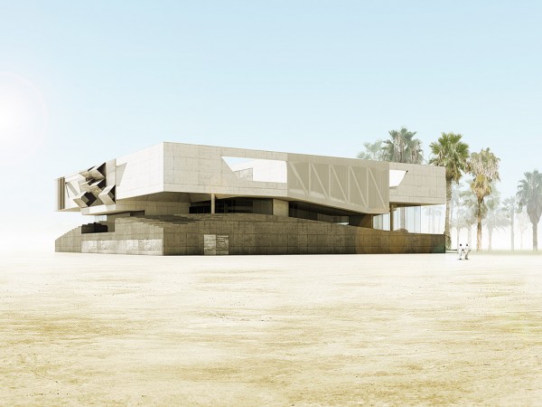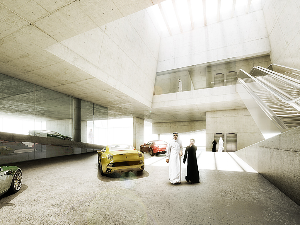 Located next to a new race track and a dragster speedway, the museum designed by MARC ANTON DAHMEN / STUDIO DMTW is another component of the projected “Motor Sports Complex“ in Kuwait City. Its main function is to be a public showroom for the King‘s private collection of vintage racing cars. Besides the main exhibition hall with approximately 50 cars, it also houses a pitbuilding including a garage for restauration, a driving school for kids, a little conference centre, a cinema and some private VIP spaces.
