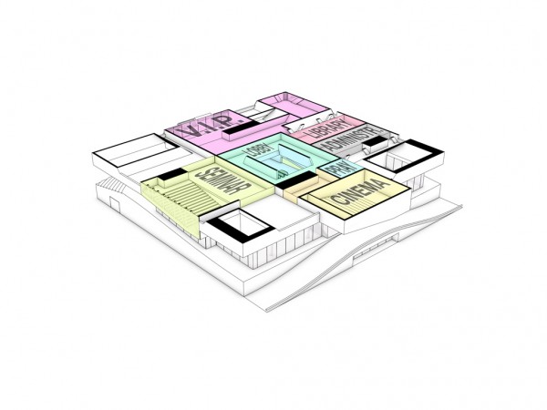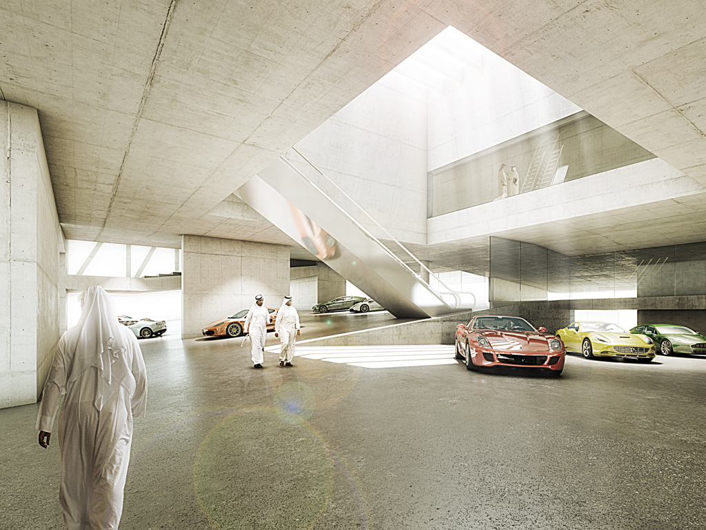 The volume is split into three main parts which are stacked on top of each other. The public layer in the middle – in between all the car-related facilities on the groundfloor and the conference spaces and VIP area on the top floor – acts as kind of an open transparent gap, presenting all the King‘s cars. A concrete landscape transforms from the exhibition space on the one side to a concentric tribune on the other side – allowing view connections to the upper and lower levels.