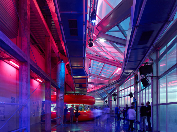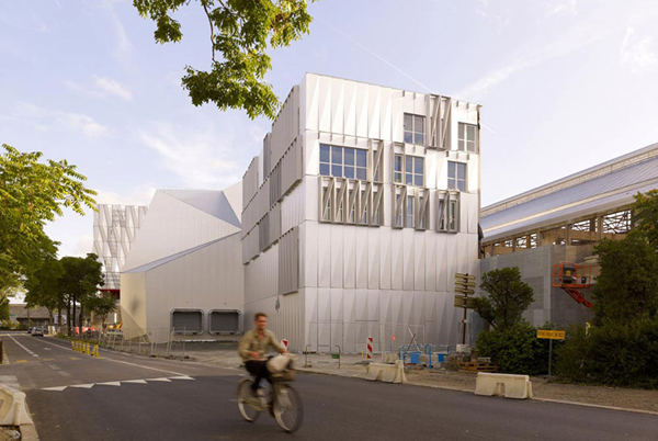 The project is made of 3 distinct elements: the 400 Hall (with offices upon it), the 1200 Hal (two parts connected by a public Hall inserted in the concrete post frame of the Halle Dubigeon) and, finally, the studios situated in a volume suspended above an old air-raid shelter.