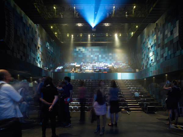 An auditorium which seats 400 individuals has been placed within the minimal concrete cube which once served as an air-raid shelter. Above the solid base, a faceted tower hosts the recording studios. The metallic volume is lifted on inclined columns generating a void which separates the two distinct building elements, doubling as an open-air terrace with views to the activity below.