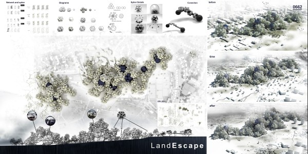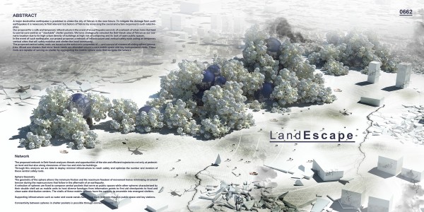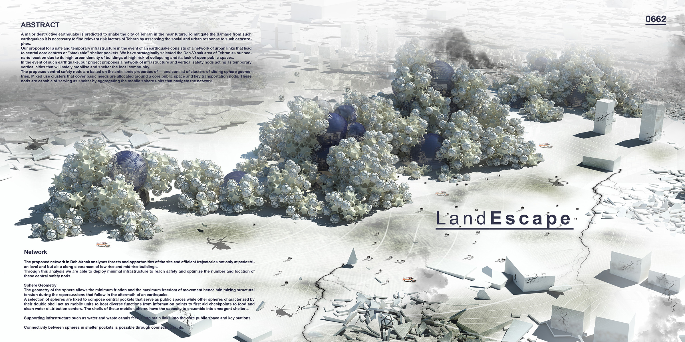 A selection of spheres are fixed to compose central pockets that serve as public spaces while other spheres characterized by their double shell act as mobile units to host diverse functions from information points to first aid checkpoints to food and clean water distribution centers. The shells of these mobile spheres have the capacity to ensemble into emergent shelters.