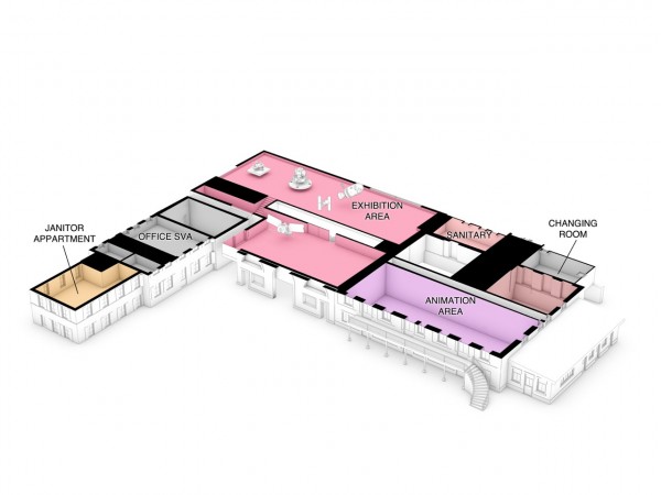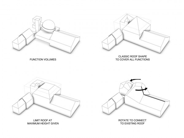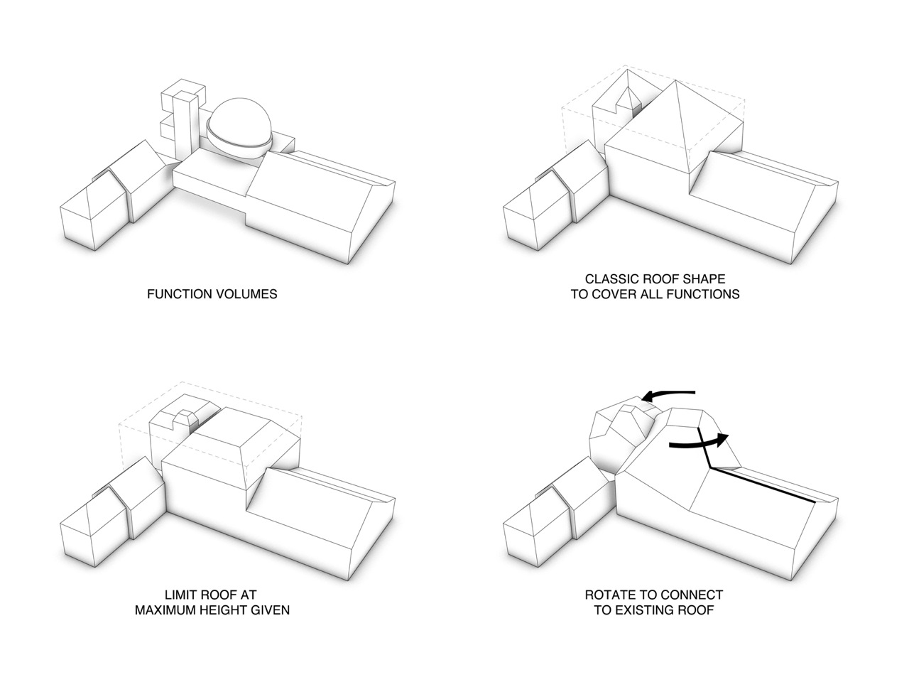 The sculptural design of the new build is developed both from functional elements, as well as by incorporating the geometry of the surrounding building. Therefore, it slots harmoniously into the existing structure and complements it without upsetting the original harmony. It takes its geometry from the edges of the roof of the existing building adjacent to it. By rotating the individual roof volumes, the new build can be connected to the existing neighbouring ridge and, at the same time, an elegant solution to covering the vast spaces and the dome can be found. In order to optimise the sculptural design spatially, all the roof peaks will be capped at the maximum structural height or lower. The exterior of the roof and wall will be lined with the same material, with large panels of zinc butted together, simplifying the sculptural design of the new build and giving it a muted effect. The same principle will be applied to the design of the interior. The floor and walls will be kept white in order to give free rein to the interplay between the shapes and the light, without seeking to make a spectacle of this. This creates indoor spaces whose atmosphere makes them perfectly suited to exhibitions. Optimal use of daylight will be achieved through the use of large window openings in the facade and carefully positioned windows in the roof. The natural light will be distributed throughout the entire building through the openings to the air space inside the new build.