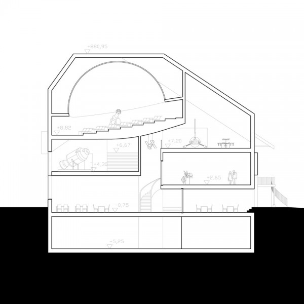 Creating a place which is devoted to showing and sharing science also means making a cultural contribution in the widest sense in a society which is characterised like no other by science and by the desire to understand our world and where we come from. A design that invites visitors to find out about and actively experience themes and correlations that exist within nature, research of space and nature poses a particular challenge. For this very reason, a task of this nature demands due respect. Logic and consequence on the one hand, respect for the culture and history of the place on the other hand play a major part in this correlation. Therefore, one of the primary objectives of this design is to identify and highlight possible synergies between the individual functional areas. The public section of the space programme can be split into two distinct function groups, the planetarium (with its solar observatory and viewing platform) and a large exhibition area (with space for presentations and workshops). The possible links between them are of interest.