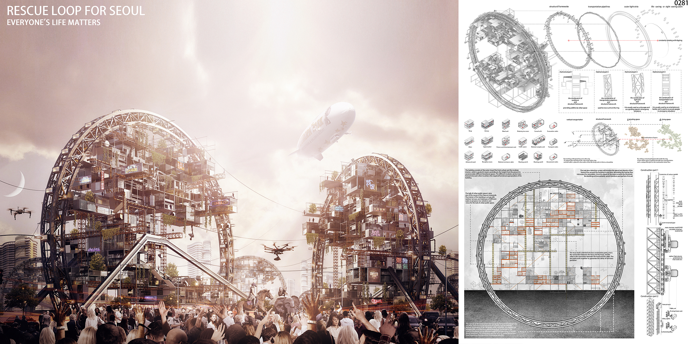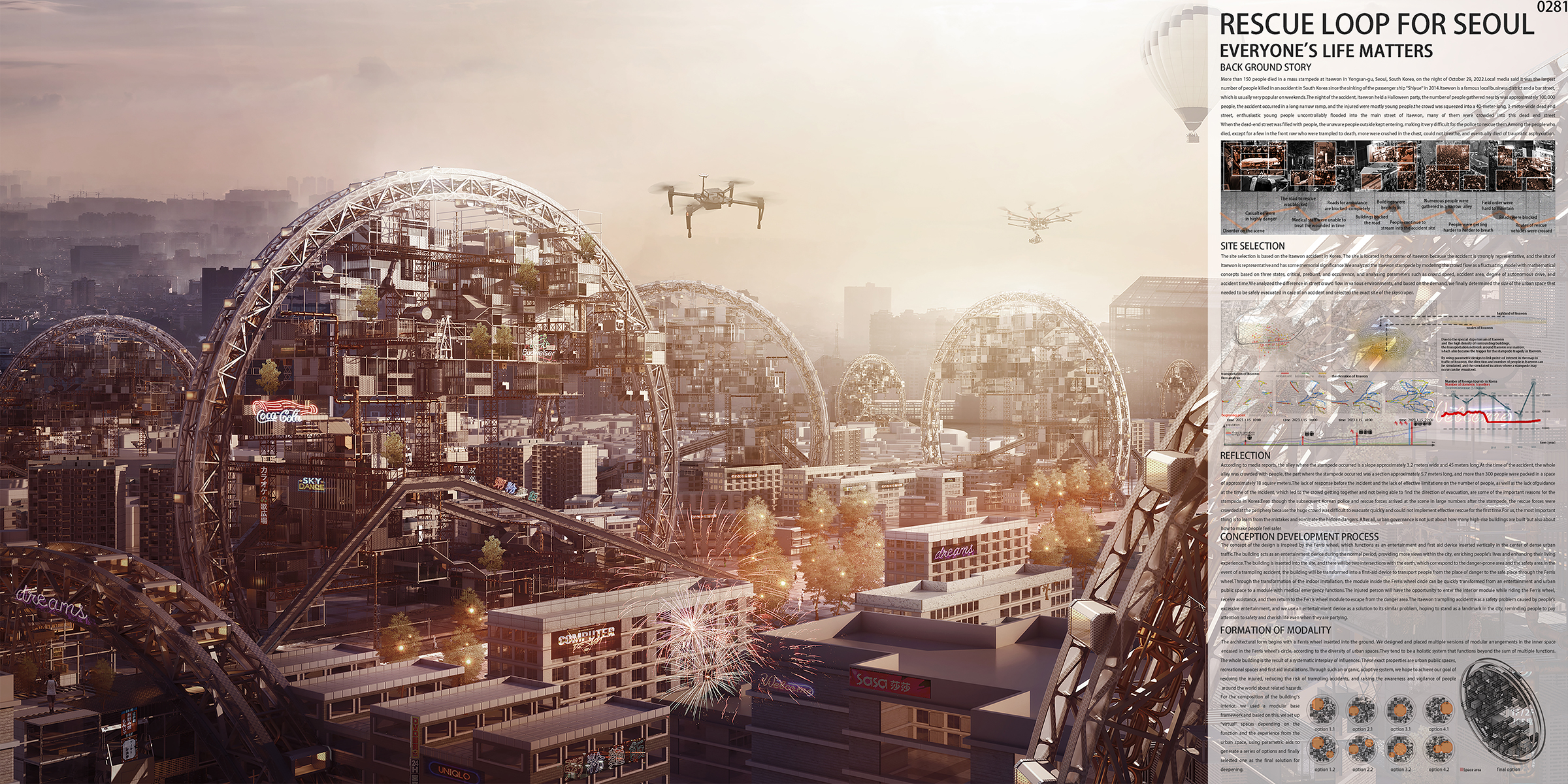 The design is inspired by the Ferris wheel, which functions as an entertainment and first aid device inserted vertically in the center of dense urban traffic. The building acts as an entertainment device during the normal period, providing more views within the city, enriching people’s lives and enhancing their living experience. In the event of a trampling accident, the building will be transformed into a first-aid device to transport people from the place of danger to the safe place through the Ferris wheel. The Itaewon trampling accident was a safety problem caused by people’s excessive entertainment, and we use an entertainment device as a solution to its similar problem, hoping to stand as a landmark in the city, reminding people to pay attention to safety and cherish life even when they are partying.