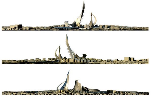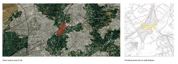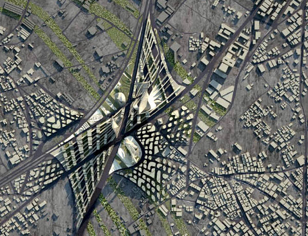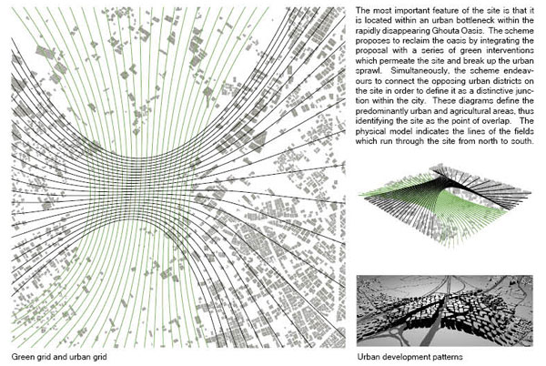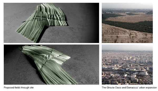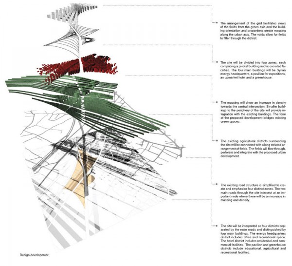 The main idea of the development is to bring people to the region while reorganizing the chaotic urban fabric. The site will be divided into four zones, each comprising a pivotal building including the Syrian Energy Headquarter, pavilion of expositions, hotel and residences, and greenhouse. The massing will increase in density toward the center with smaller buildings in the periphery that will blend with the existing buildings. The agricultural districts will be connected through news fields that will cross the entire plan and provide green areas through out the development.