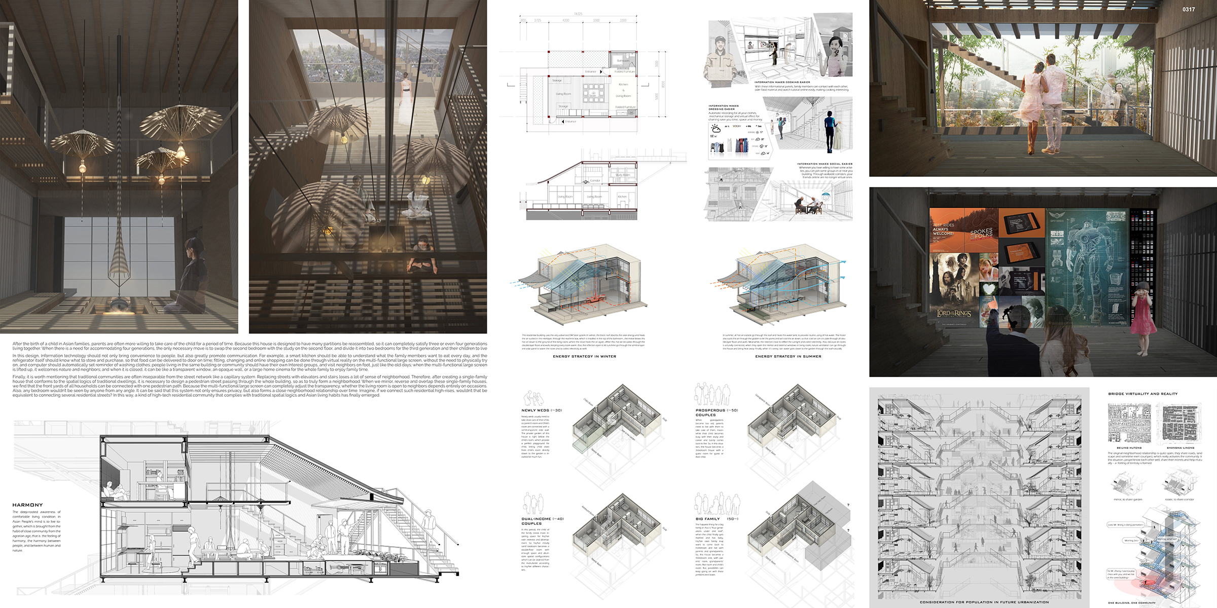 To combine the best of traditional Asian communities and technologies, we need to dig the essence of the spatial logics to solve the puzzle. Courtyard is always the essential element for traditional Asian residences, for sharing public activities. My idea is to break the modern social boundaries by creating a central indoor courtyard space and surrounding it with all other rooms for each household. Upon creating a physical set for connecting all family members and neighbors, we can overlay these physical accesses with virtual connections by using VR, AR and other information technologies, so that people can share and interact naturally and seamlessly. Moreover, with sustainable construction, energy saving and prefabrication technologies, we can not only customize the living units to accommodate several generations living together as big families, but also, we are creating a better future of social relationships and natural environment for the coming many generations.