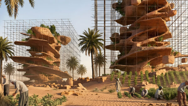In the Lut Desert of Iran, near Shahdad — the hottest point on Earth — the abandoned village of Keshit has become a concentrated manifestation of this crisis: rising temperatures, sandstorms, and prolonged droughts have gradually made life impossible. Waves of migration have emptied the village of its inhabitants, and the ecosystem has collapsed. The project’s challenge begins here: instead of imposing yet another human-made structure on this land, how can a framework be created in which nature itself becomes the active agent of restoration? Here, the wind, the sand, and the tamarisk trees are the principal architects. The project reinterprets the desert phenomenon of nebkha — a vegetated sand mound formed by the accumulation of wind-borne sand around a plant —as a living architectural material, aided by qanat systems. What was once erosion becomes construction; the aim is not to build against the desert, but to build from within its own mechanisms.
