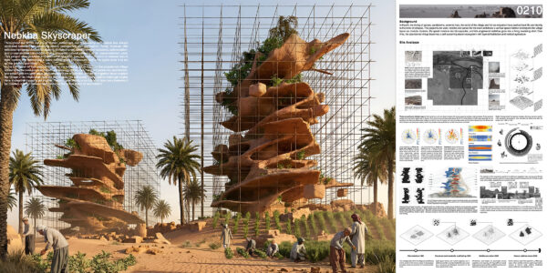 Meanwhile, nebkha undergoes accelerated adaptive mutation, organically spreading across the structure and gradually engulfing the village. Architecture and ecology merge into a single evolving organism.