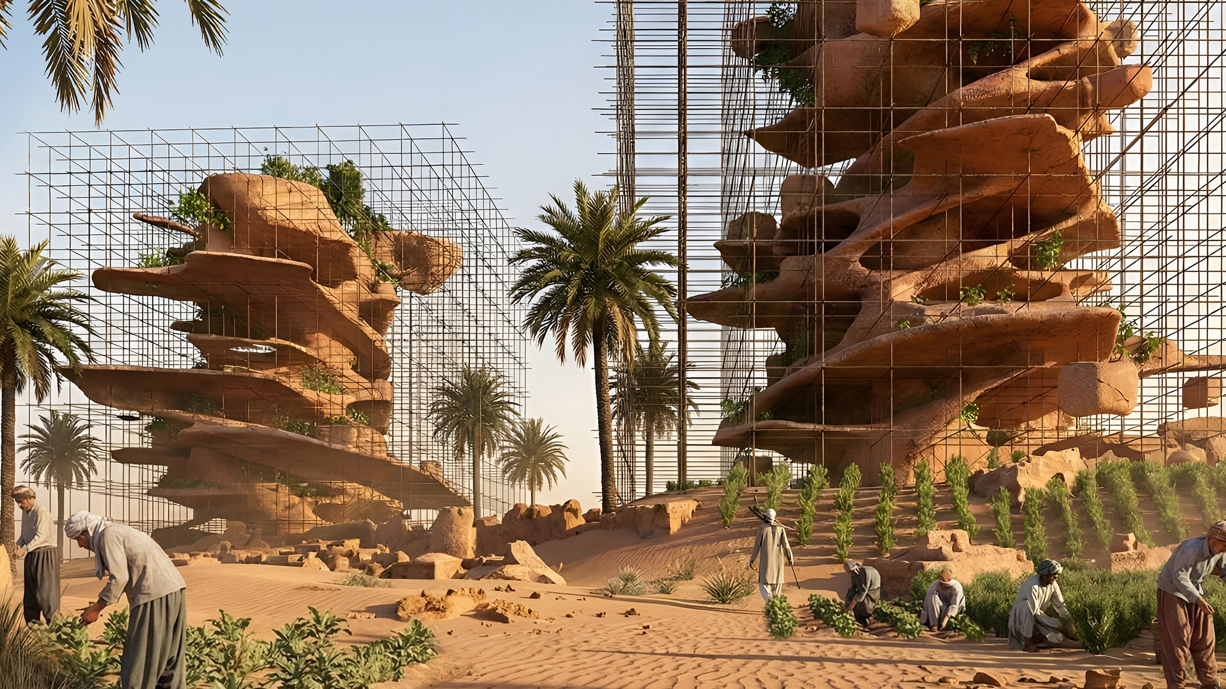 Meanwhile, nebkha undergoes accelerated adaptive mutation, organically spreading across the structure and gradually engulfing the village. Architecture and ecology merge into a single evolving organism.