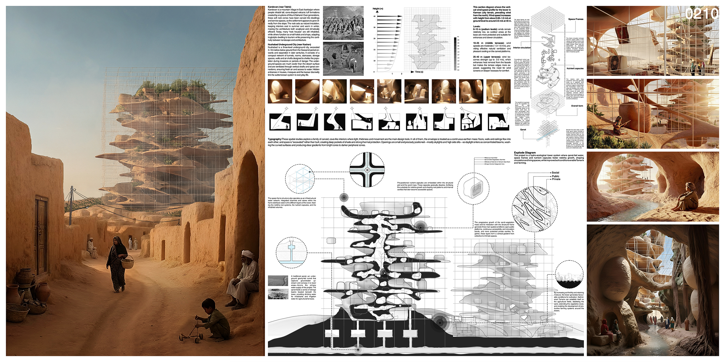 The project unfolds across several temporal phases: from the initial phase of site zoning and limited qanat revival, to the short-term phase of planting and the installation of capsules, to the mid-term phase in which the nabkha, guided by the wind, spreads across the grid and blankets the village layer by layer, and finally reaching a long-term phase where fertile cavities emerge for habitation, agriculture, and self-sufficiency.Over time, this system extends toward Shahdad, forming a continuous ecological network at the scale of the desert. Ultimately, the project reverses decay— abandonment becomes life, and a harsh climate becomes a generative force.Keshit is no longer a dead village; it becomes a resilient, self-sustaining, vertical desert ecosystem.