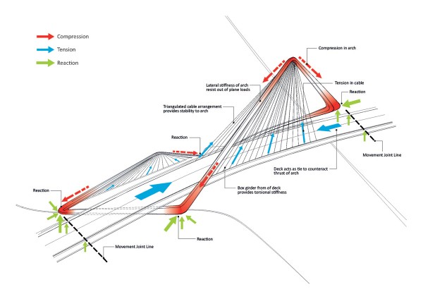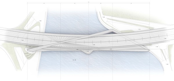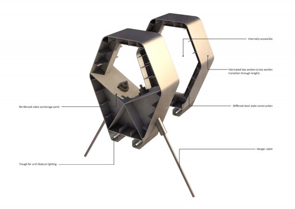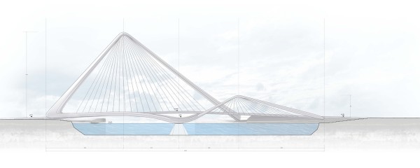 The winning bridge scheme proposes an undulating ribbon of structure that wraps around the 6 lane road deck in a continuous sculptural loop form. At low levels the loop cradles the road deck, with the structural ribbon then soaring upwards to create 2 triangulated arch forms. These triangular gateways, one primary and one secondary, support the road deck over 2 separate distinct spans via suspension cables. The primary triangulated gate is 100m in height and by diagonally crossing the deck of the bridge celebrating not only the crossing of vehicular and pedestrian traffic, but also the meeting point of the canal with the Pearl River Delta.